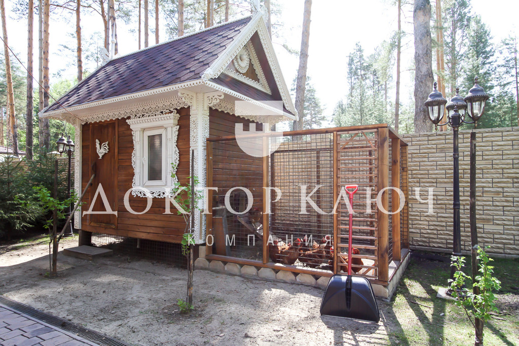 На продажу выставили трёхэтажный коттедж в Заельцовском районе Новосибирска. Площадь дома — 960 кв. метров. Рядом с ним на участке построен небольшой, но очень живописный курятник, украшенный резными наличниками.