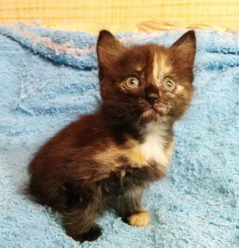 «У котёнка оторван хвостик, отсутствует участок позвоночного столба, тазобедренный сустав не развит, задние лапки не адаптированы. Она как лягушонок скачет», — рассказывает волонтёр Виктория Каратушина. И добавляет, что это — либо последствия родовой травмы, либо врождённые дефекты.