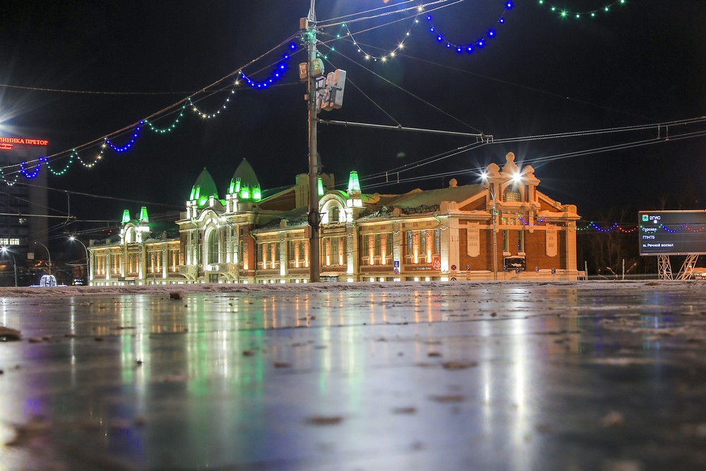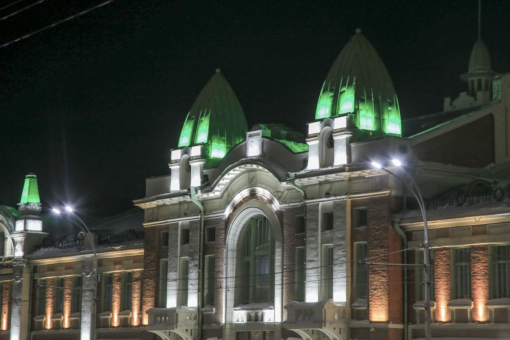 Фасад новосибирского краеведческого музея украсили эффектной подсветкой. Больше сотни ламп освещают здание в вечернее и ночное время — так что знаменитые зелёные башенки на крыше теперь будут видны всем издалека.