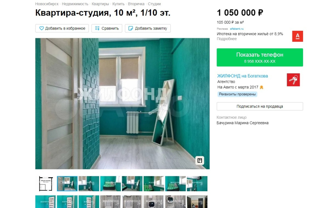 В объявлении о продаже, опубликованном на Авито, говорится, что студия расположена на первом этаже десятиэтажного дома по адресу улица Владимира Высоцкого, 139/14. Общая площадь квартиры — десять квадратов, жилая — шесть.