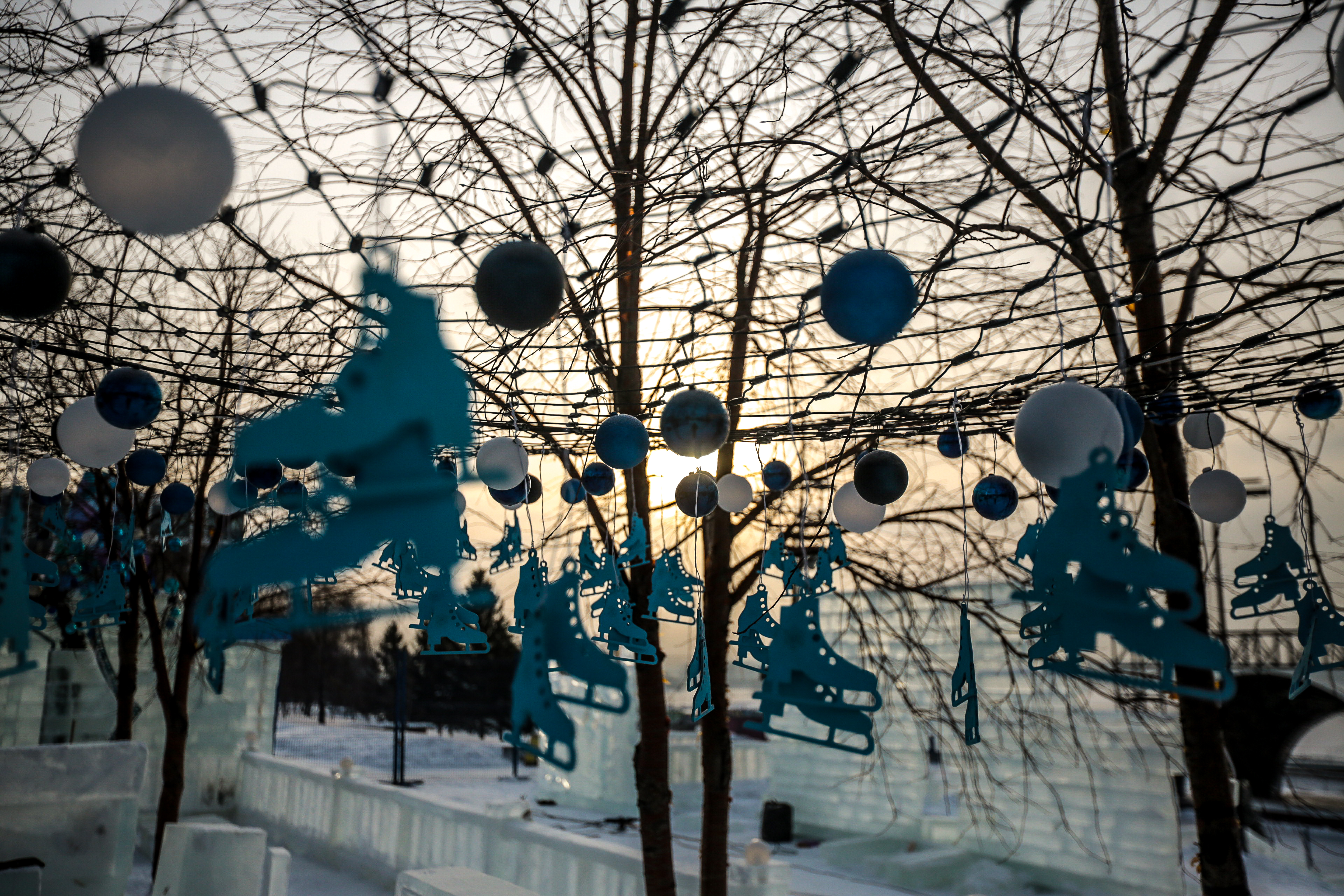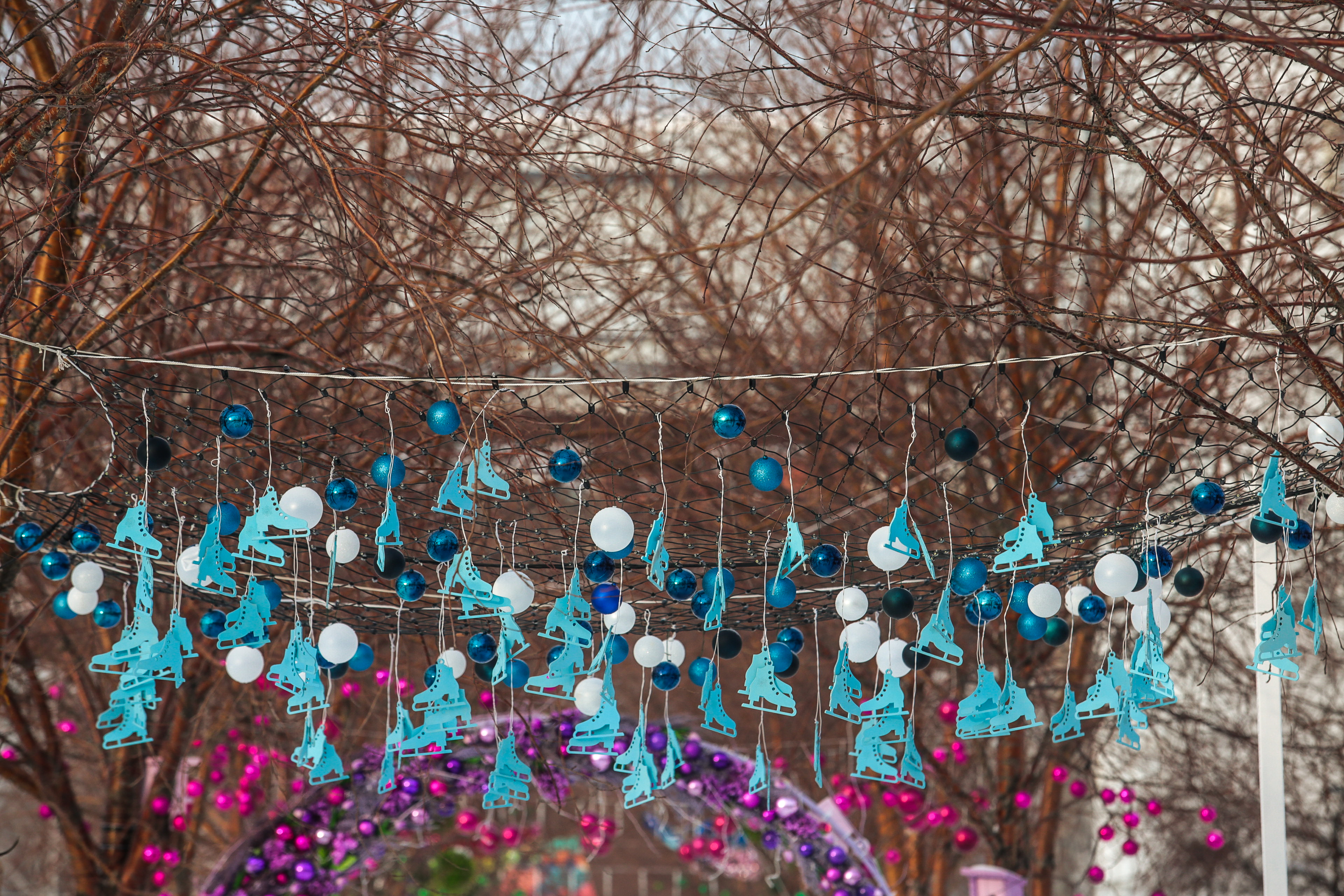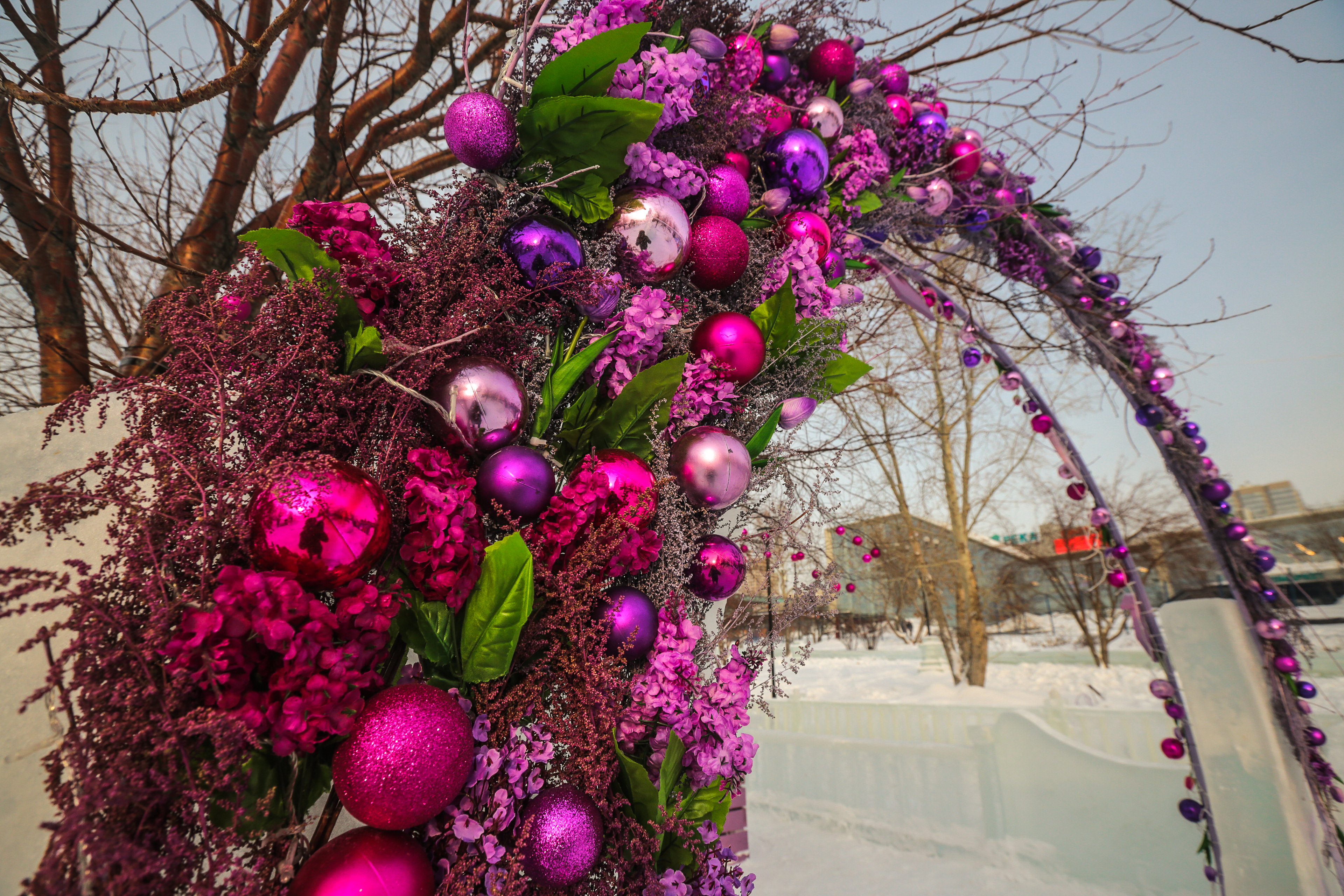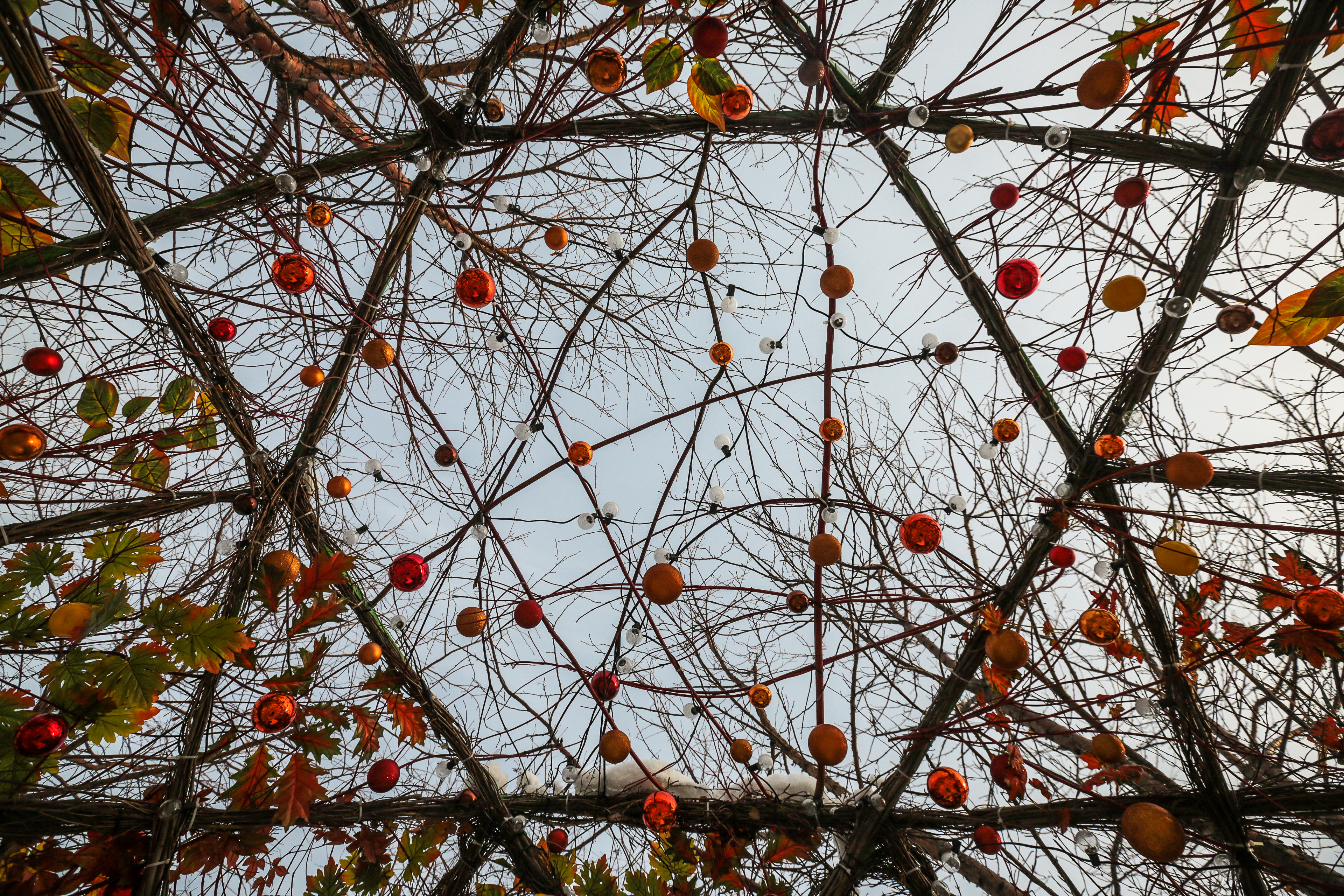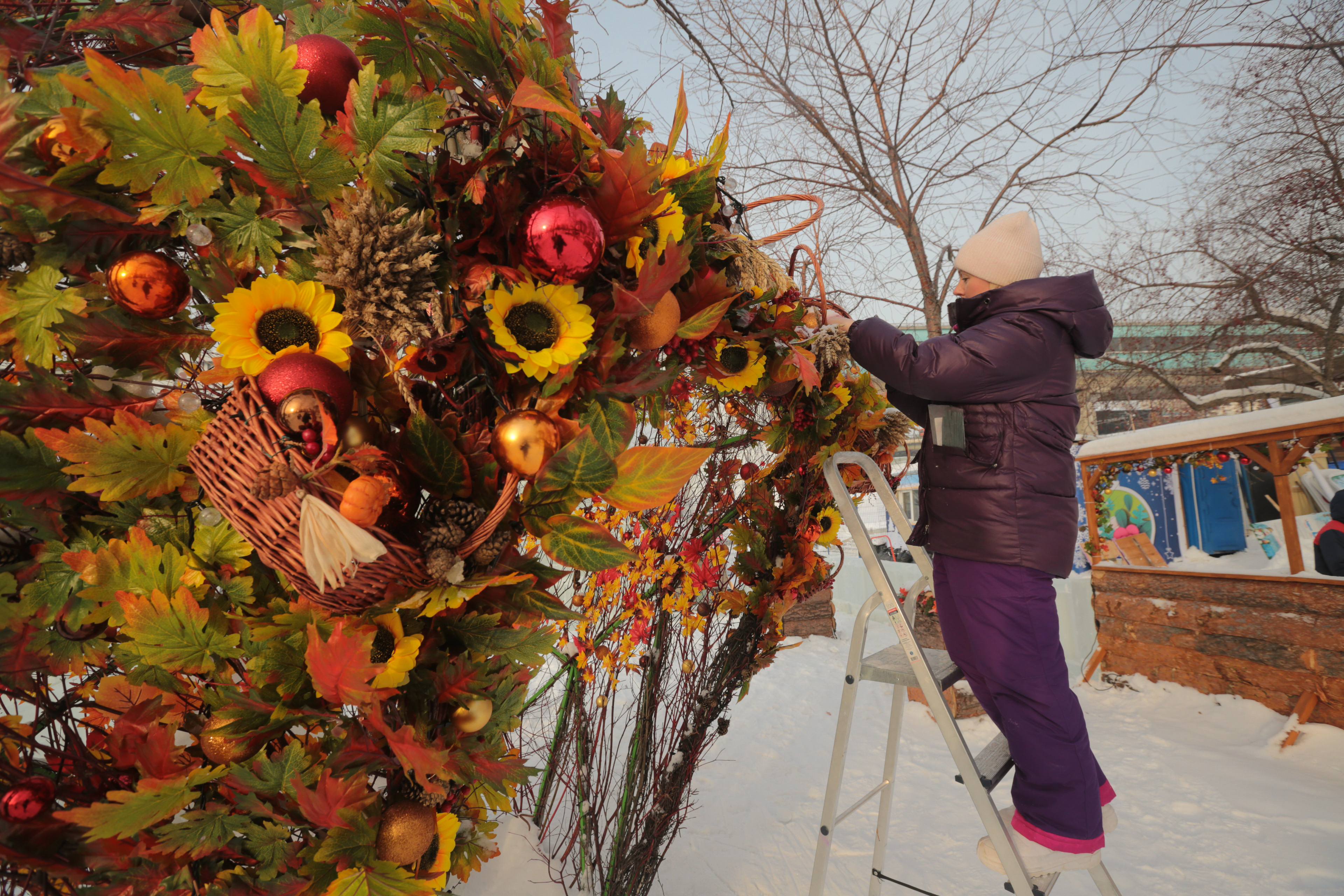 В этом году скульптуры оформили в соответствии с временами года: тут есть и весенние бабочки, и осенние корзины. Откроют одну из главных праздничных площадок 30 декабря.