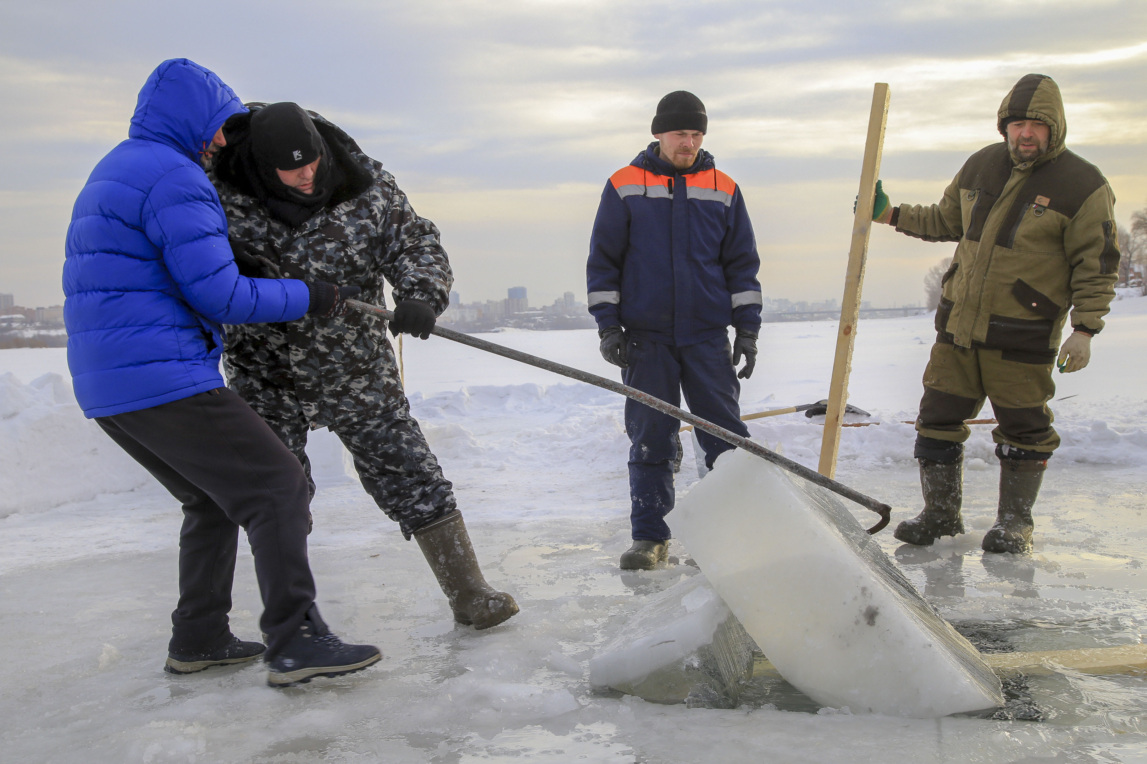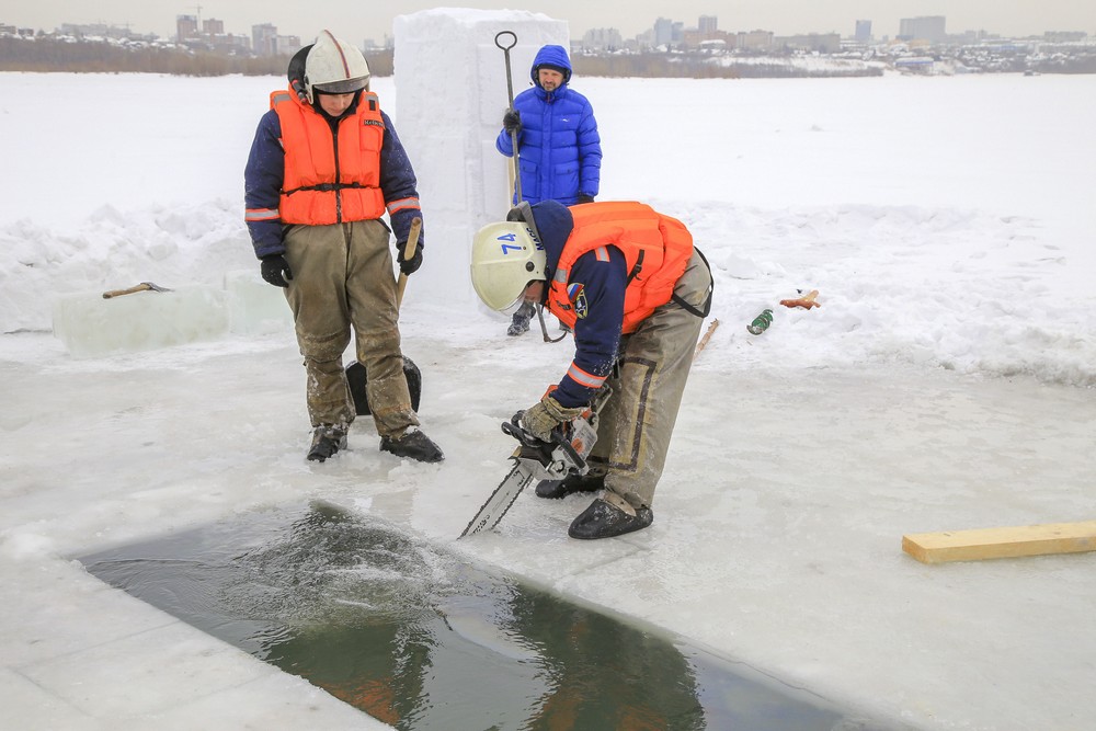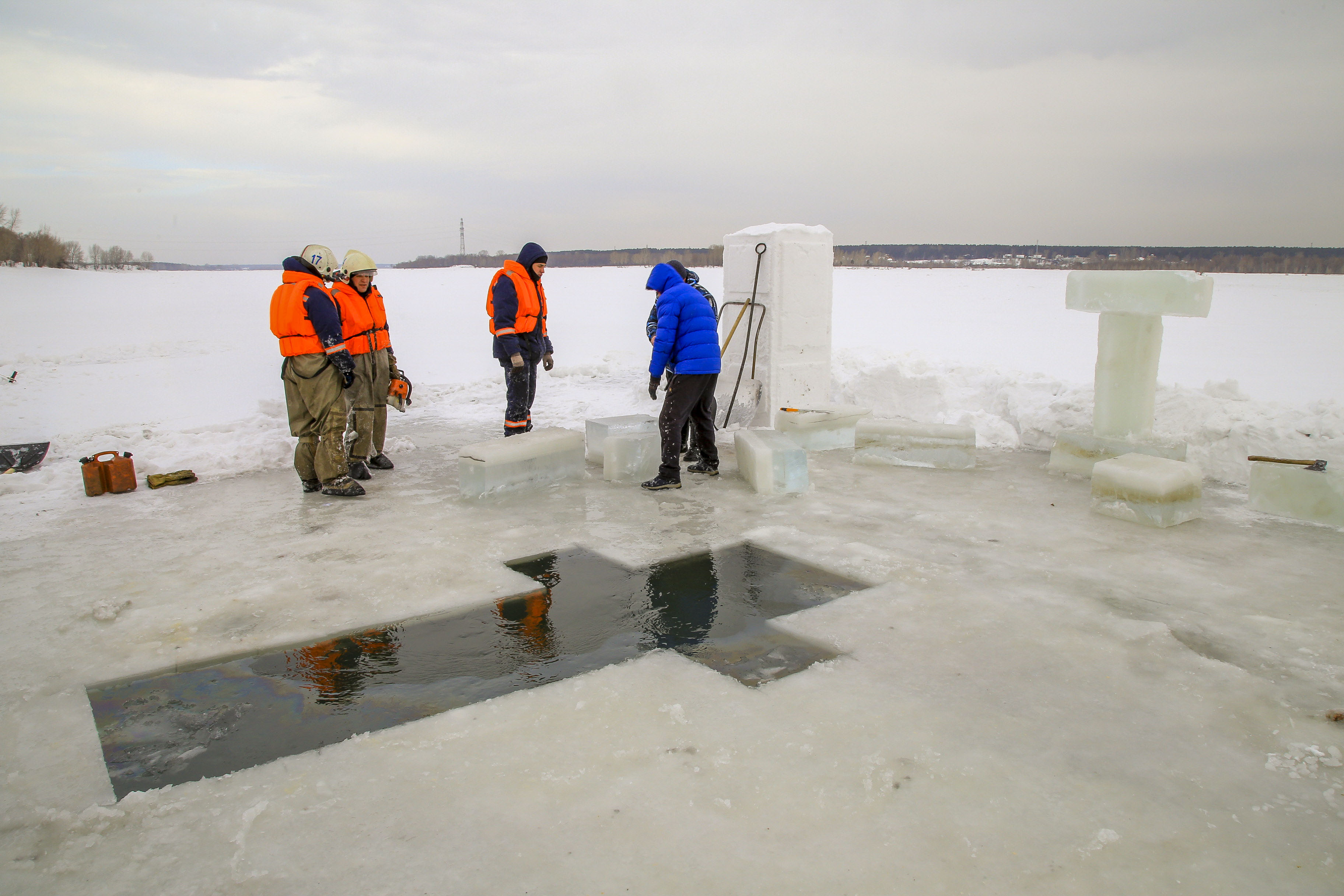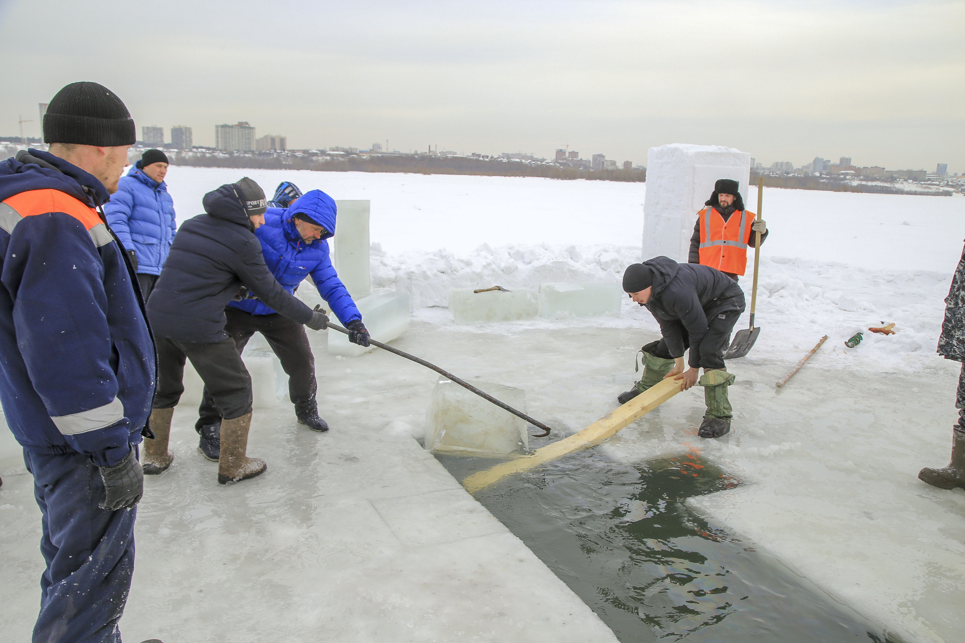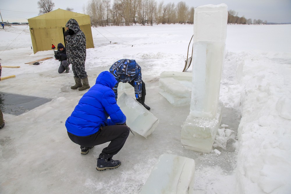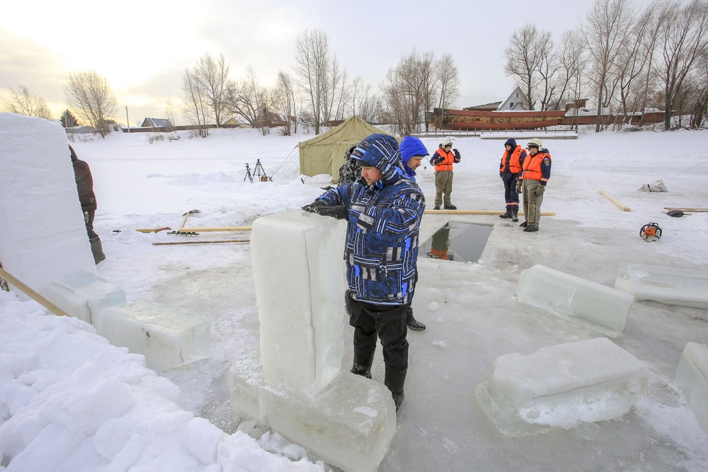 Лезвие пилы почти полностью уходит в лёд. Огромные ледяные кубы подцепляют из воды багром. Из них выстраивают крест, он символизирует место для омовения на Крещение. С погодой повезло — сооружать купель не холодно. В микрорайоне «Затон» её делают местные жители.