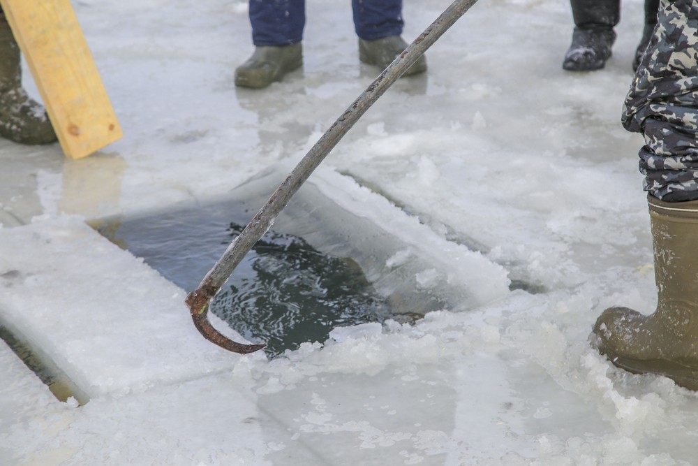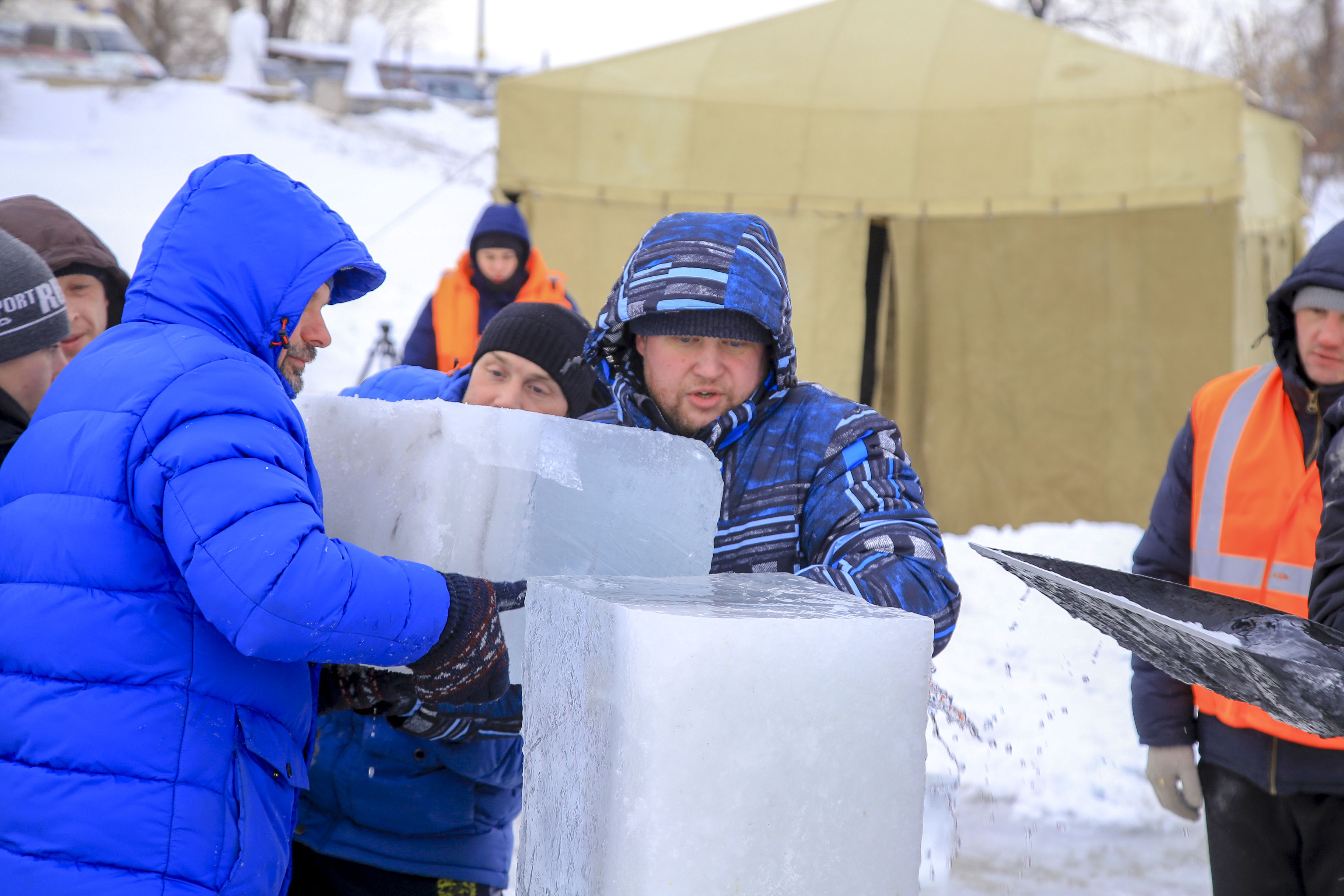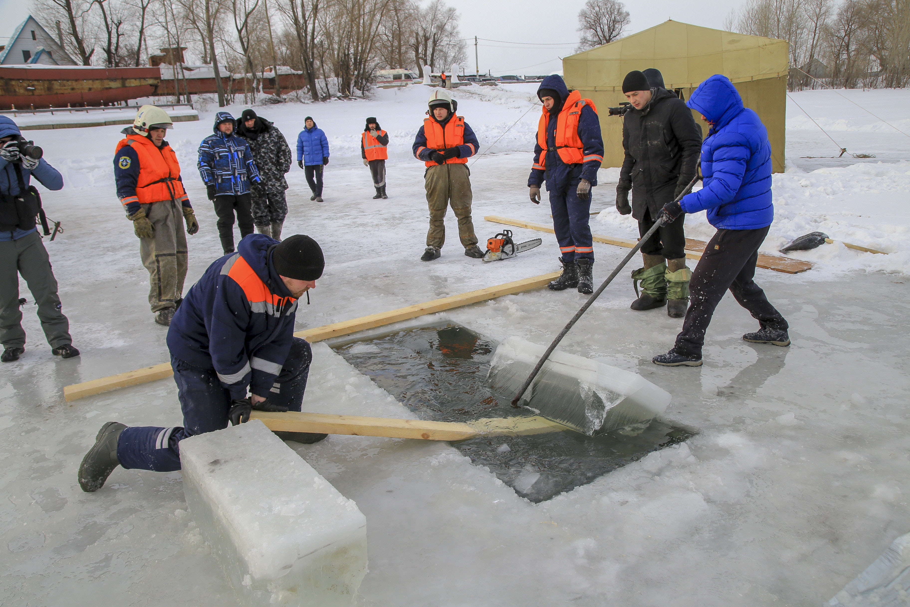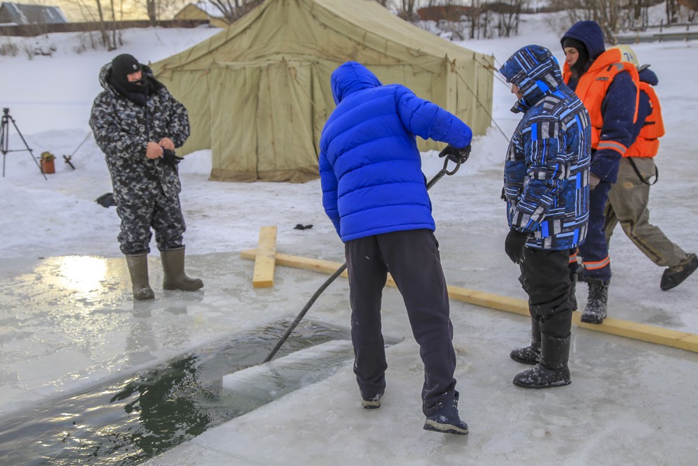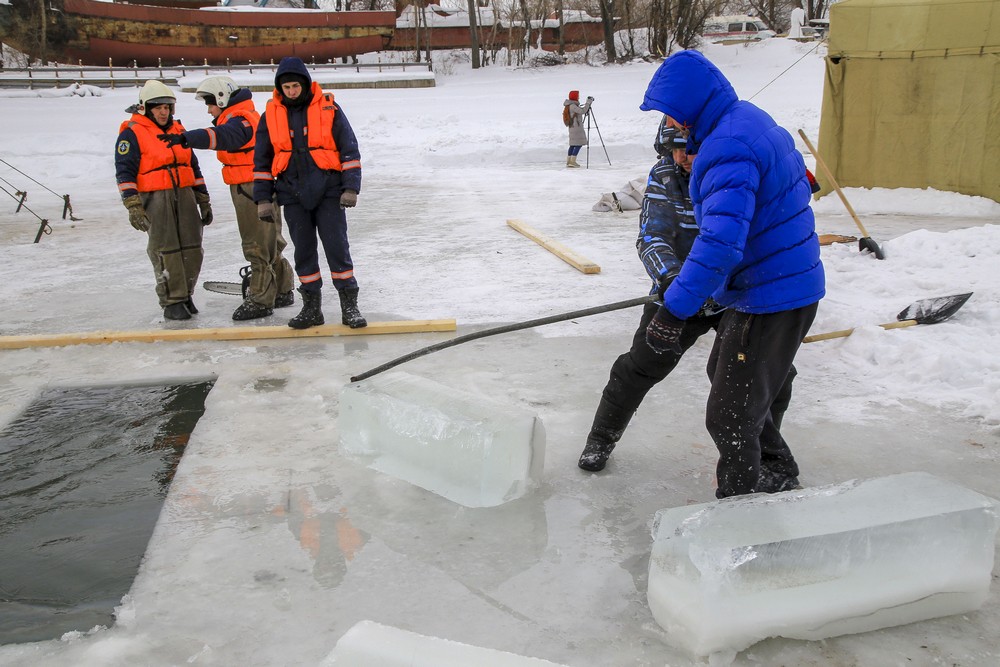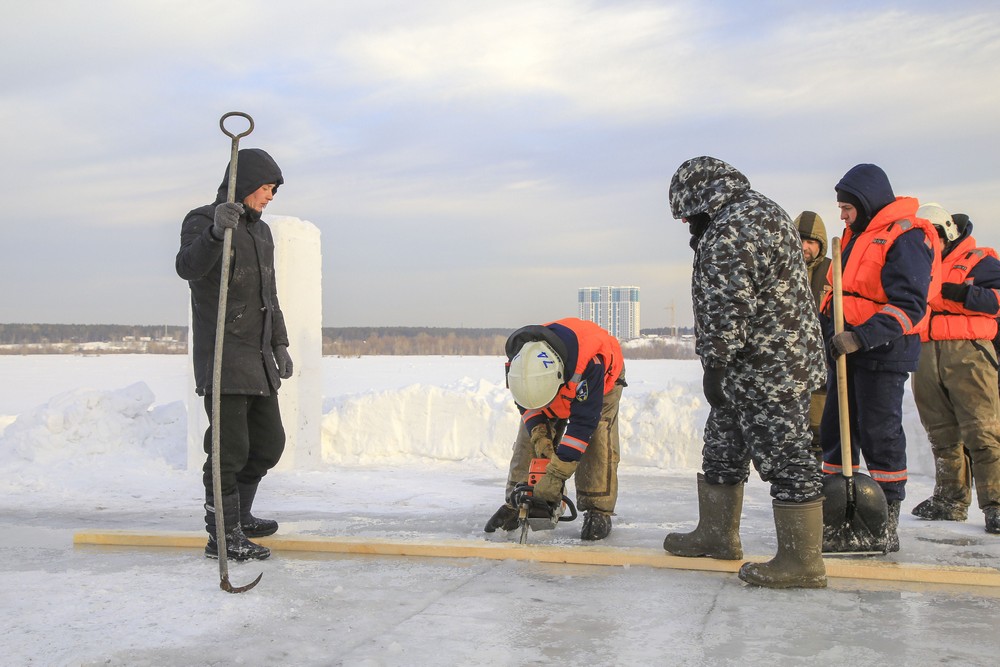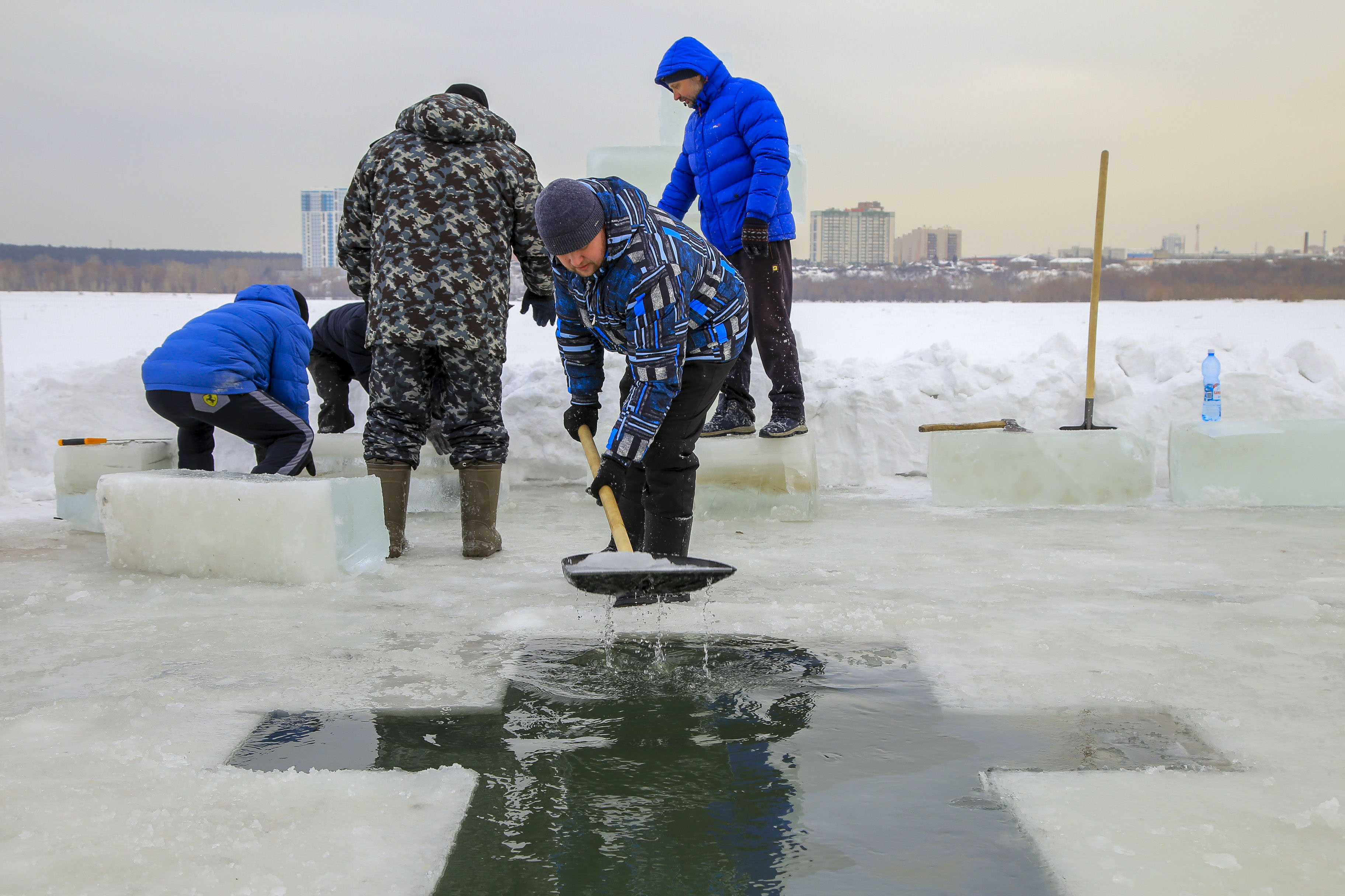 Лезвие пилы почти полностью уходит в лёд. Огромные ледяные кубы подцепляют из воды багром. Из них выстраивают крест, он символизирует место для омовения на Крещение. С погодой повезло — сооружать купель не холодно. В микрорайоне «Затон» её делают местные жители.