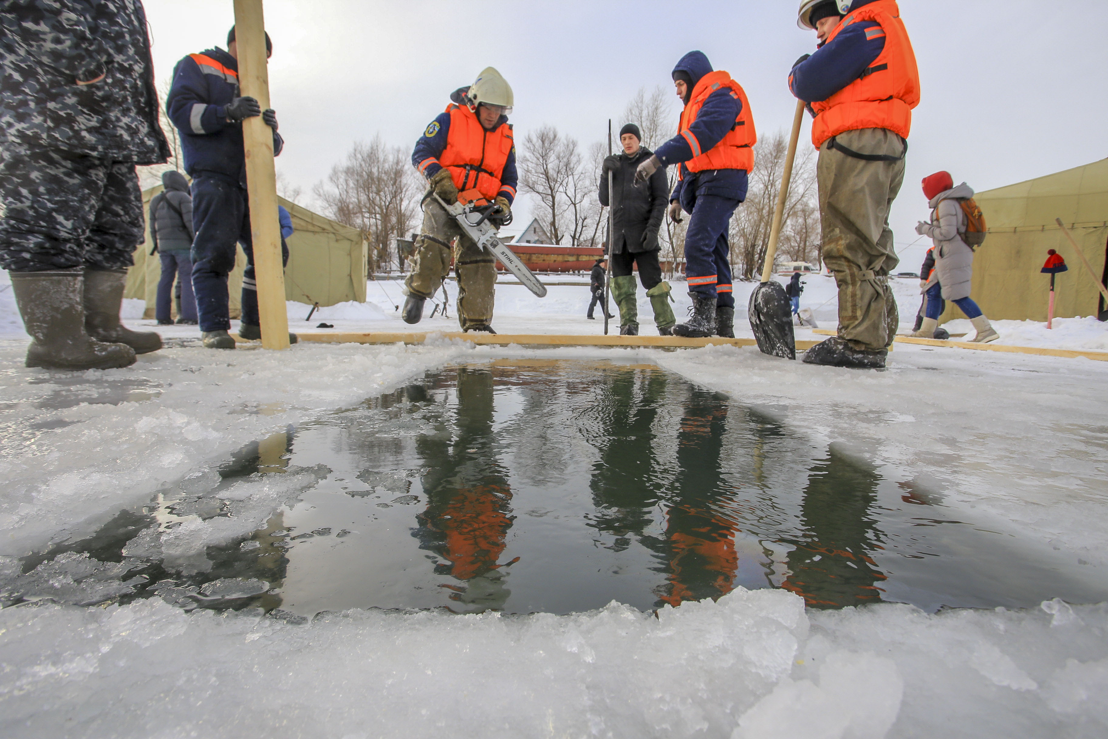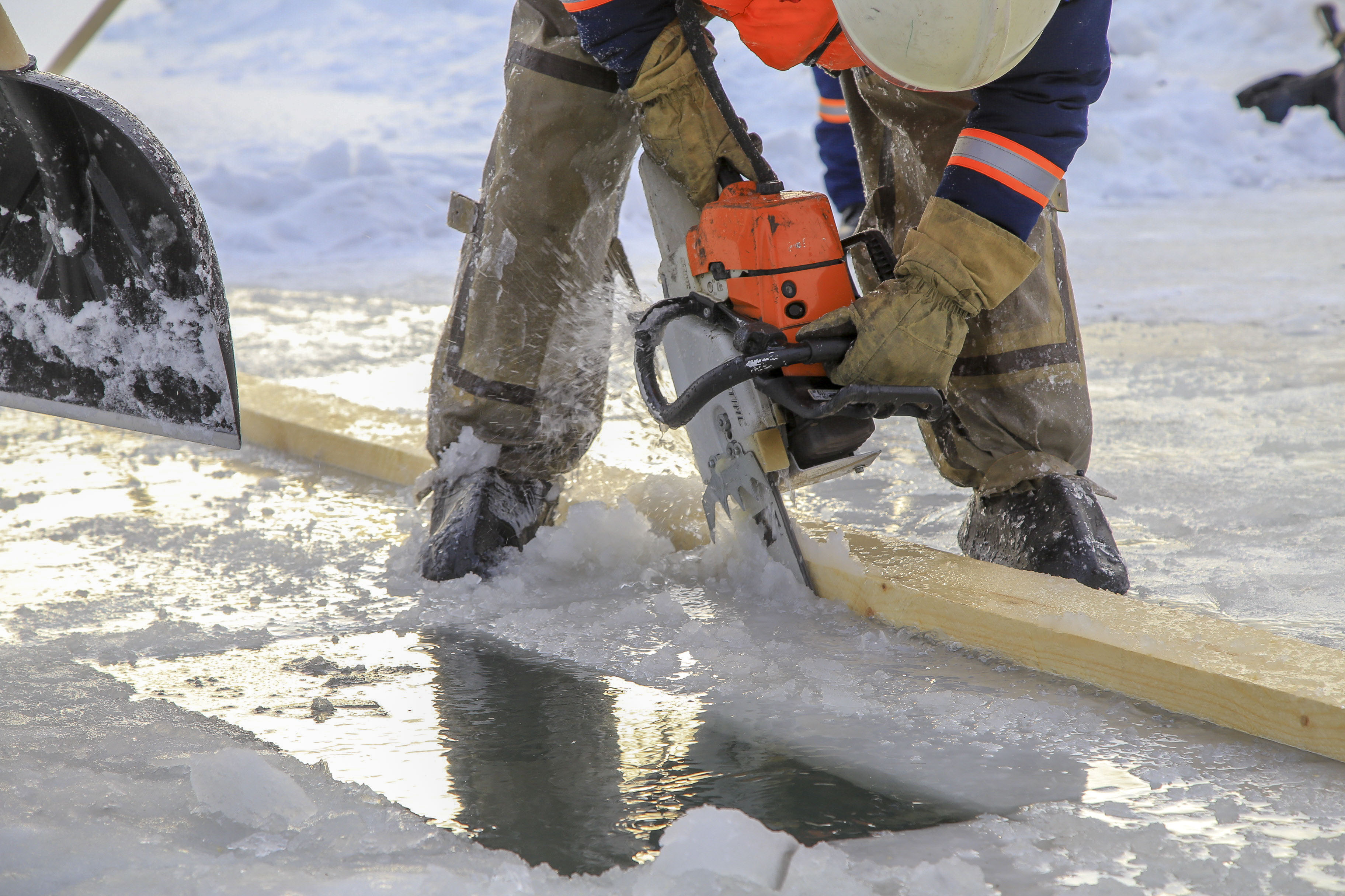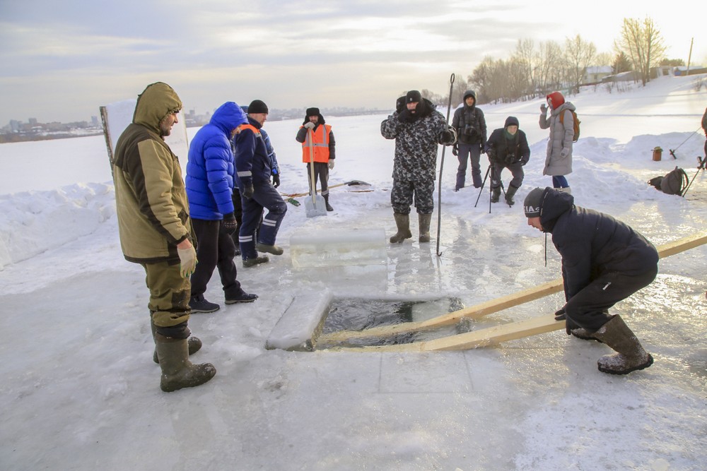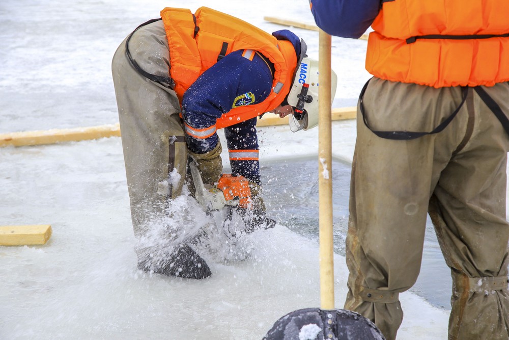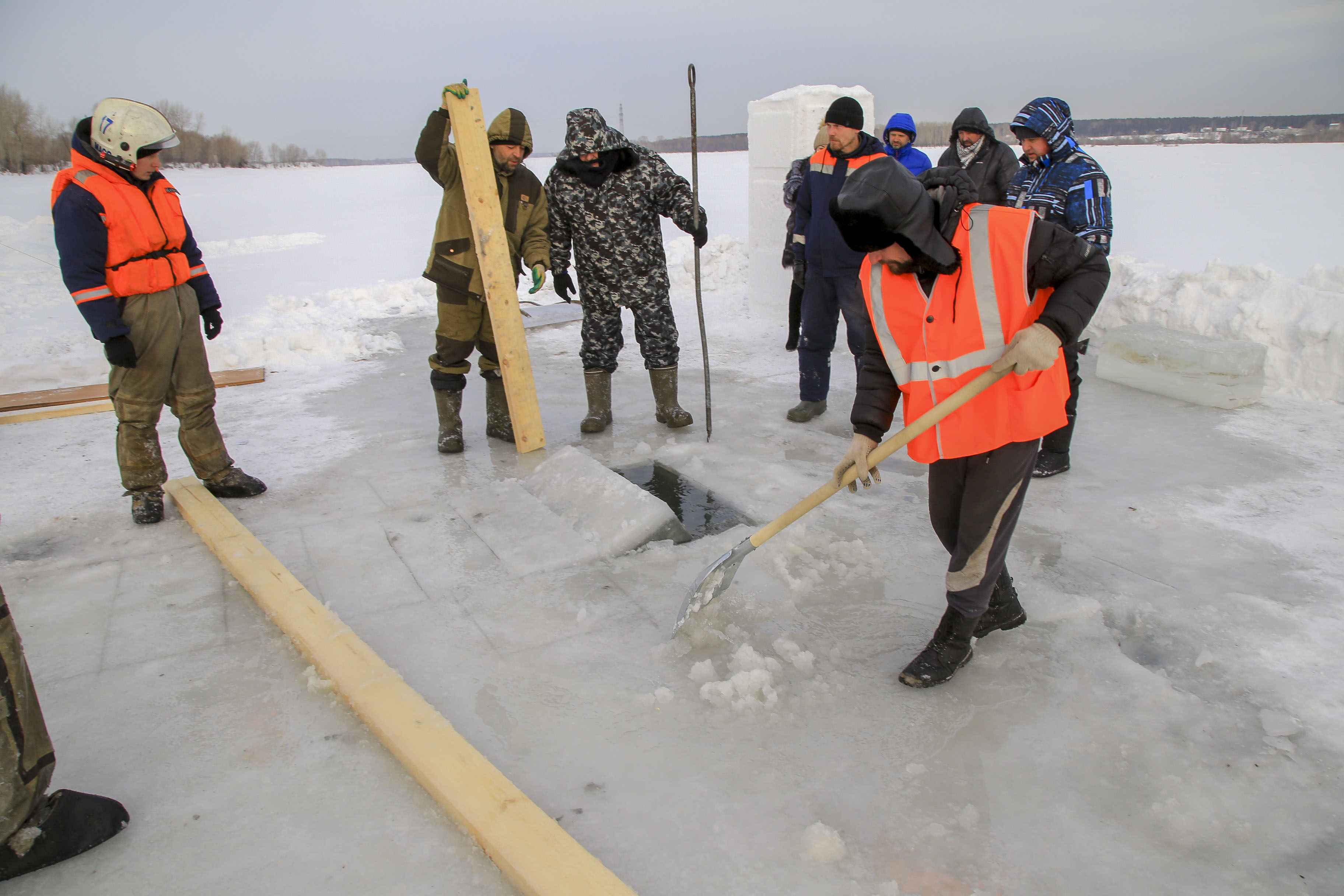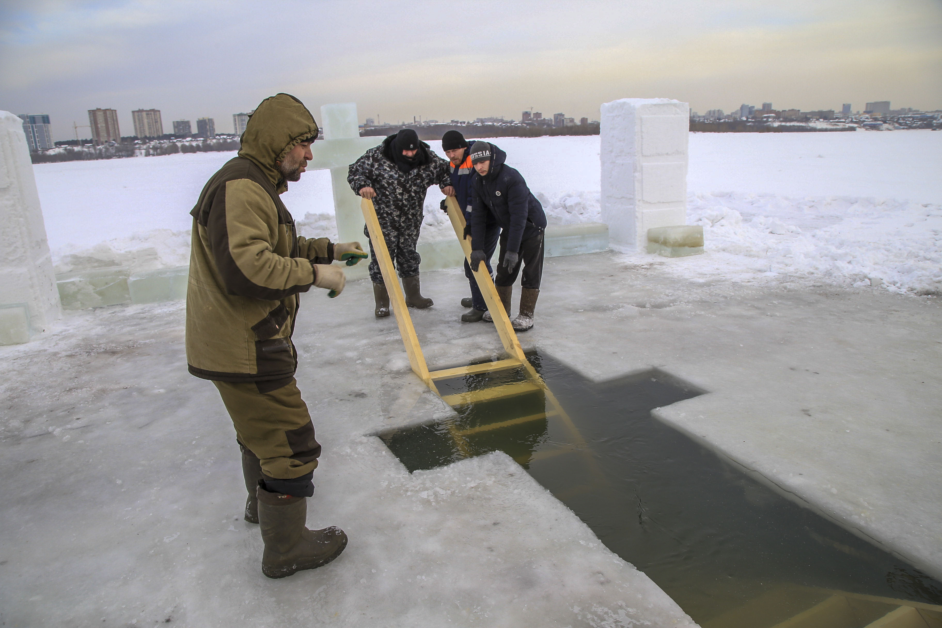 Лезвие пилы почти полностью уходит в лёд. Огромные ледяные кубы подцепляют из воды багром. Из них выстраивают крест, он символизирует место для омовения на Крещение. С погодой повезло — сооружать купель не холодно. В микрорайоне «Затон» её делают местные жители.