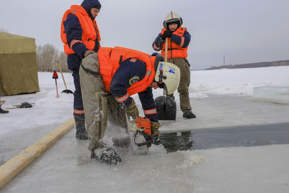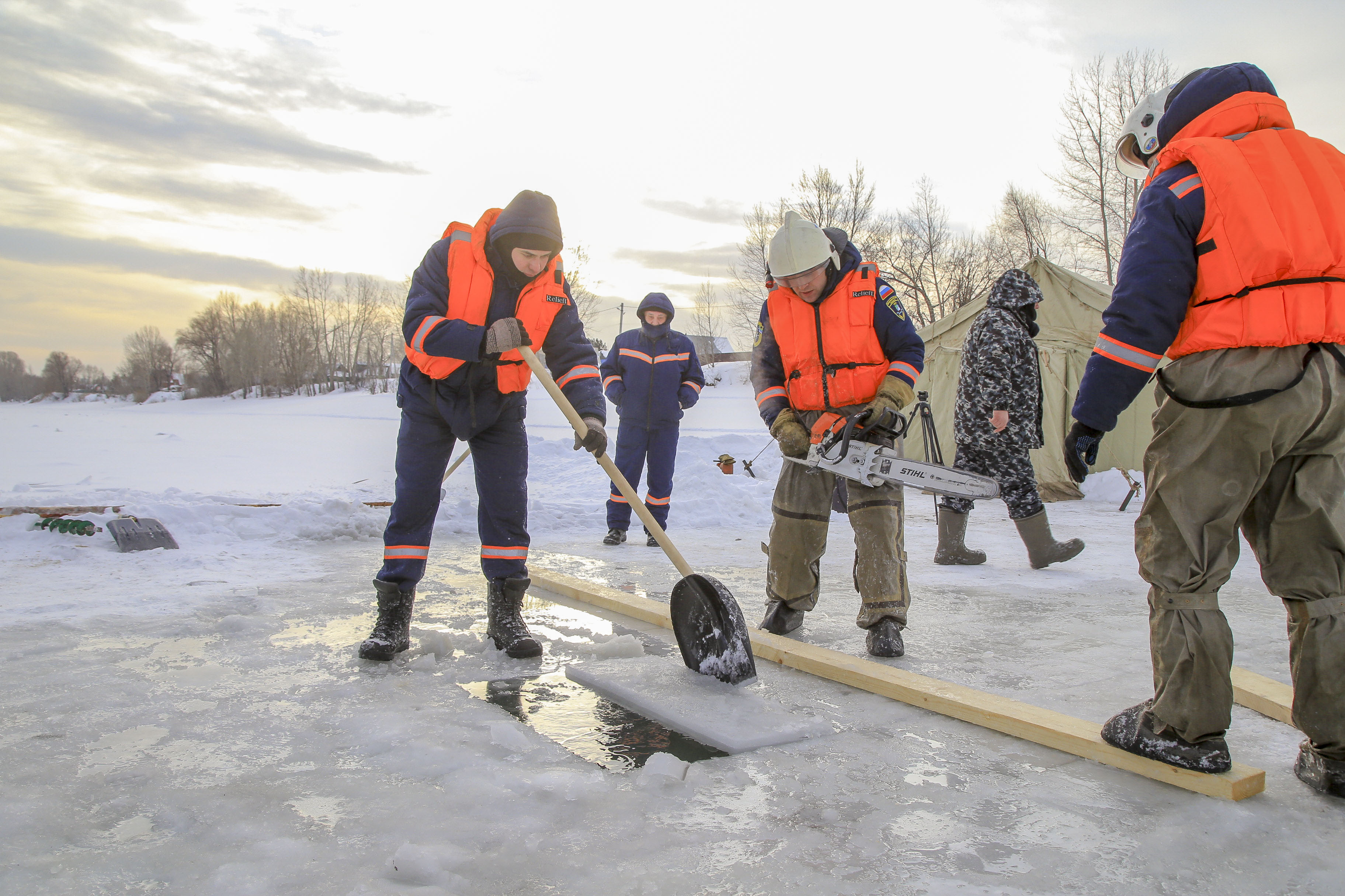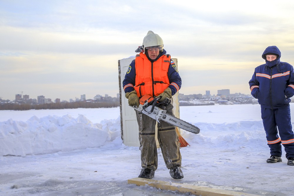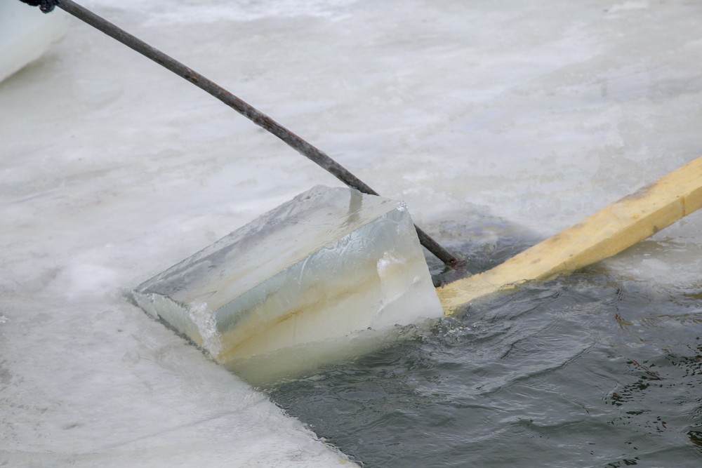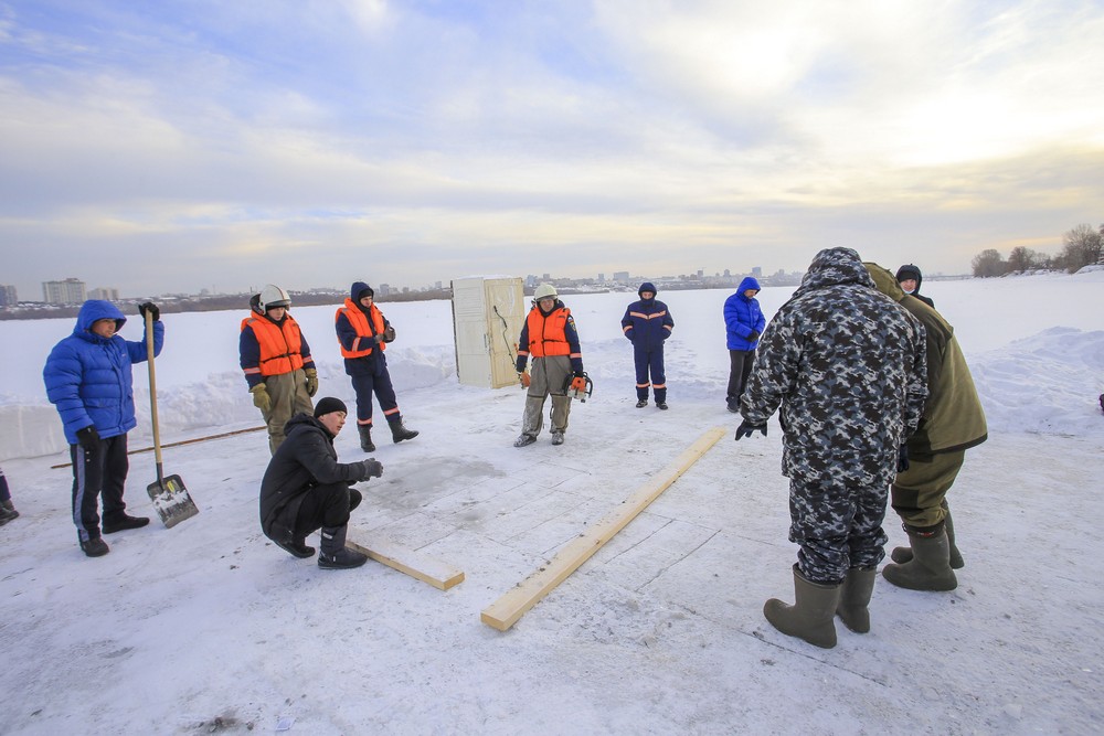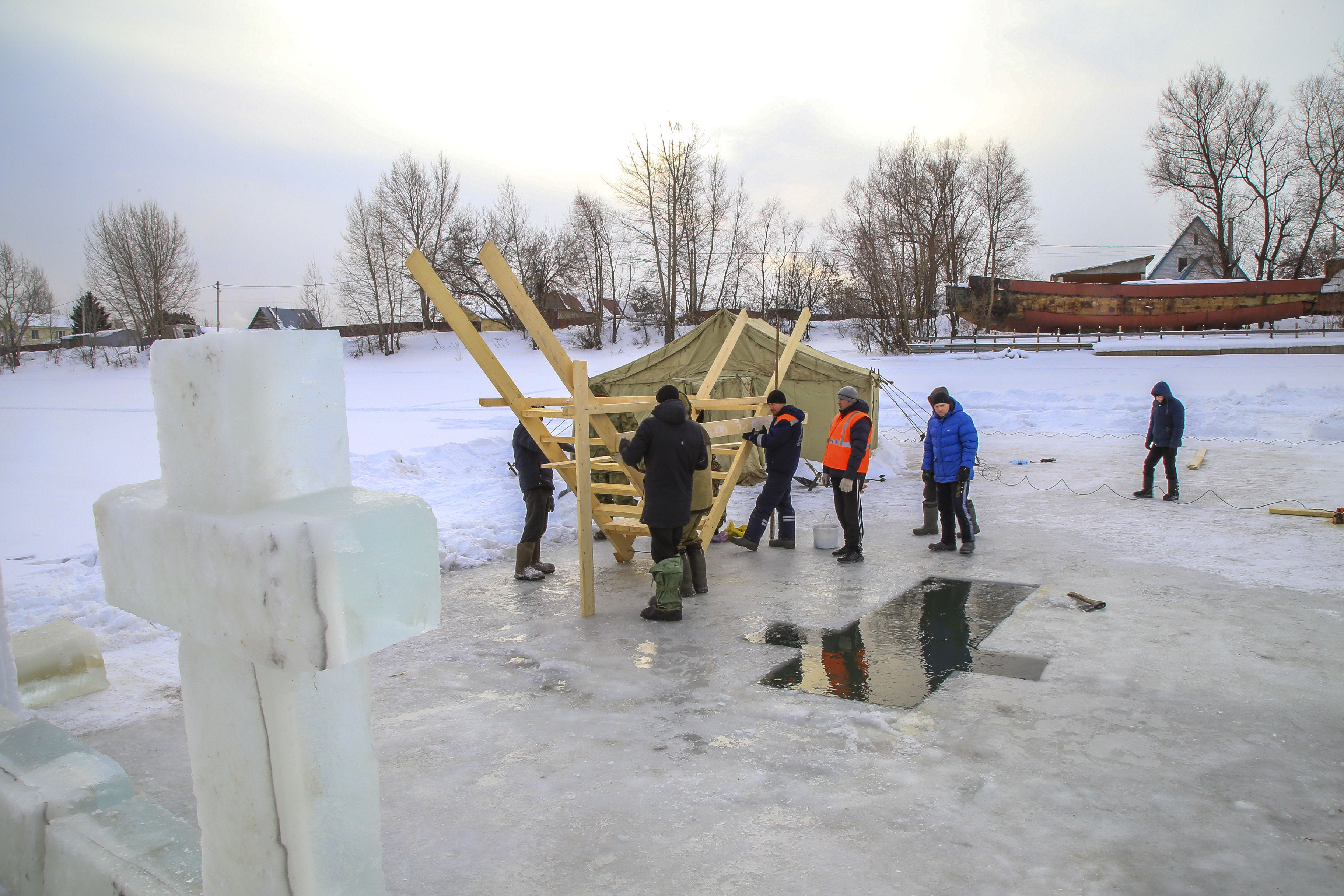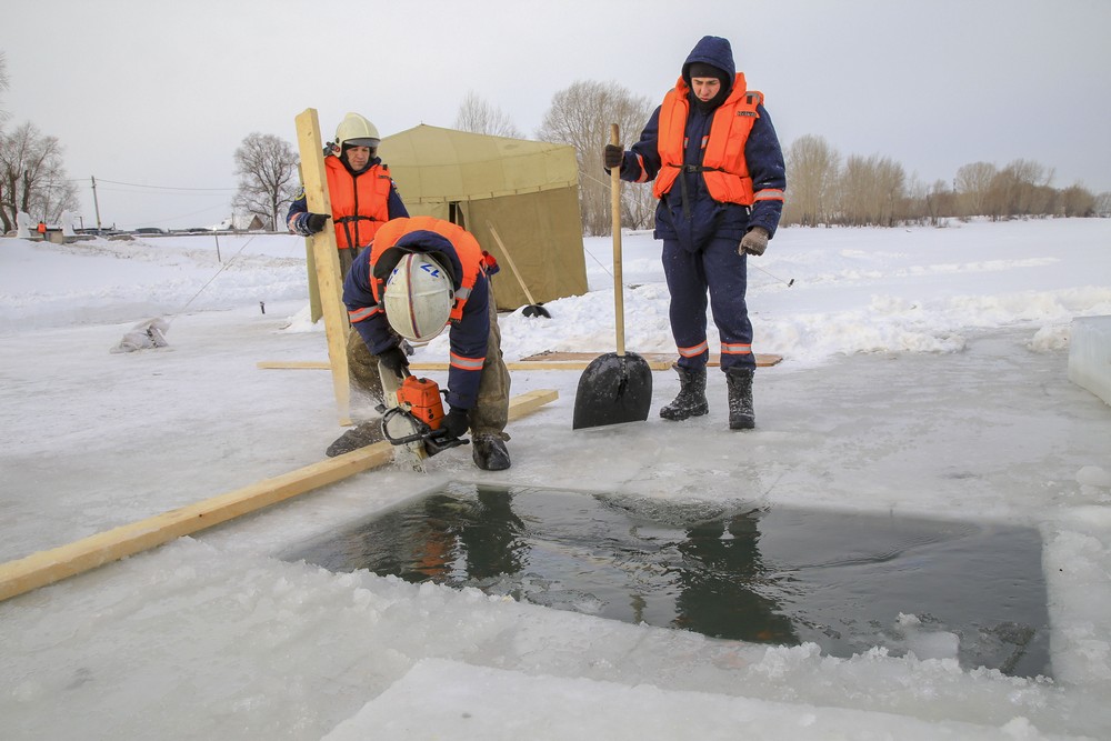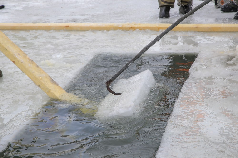 Лезвие пилы почти полностью уходит в лёд. Огромные ледяные кубы подцепляют из воды багром. Из них выстраивают крест, он символизирует место для омовения на Крещение. С погодой повезло — сооружать купель не холодно. В микрорайоне «Затон» её делают местные жители.