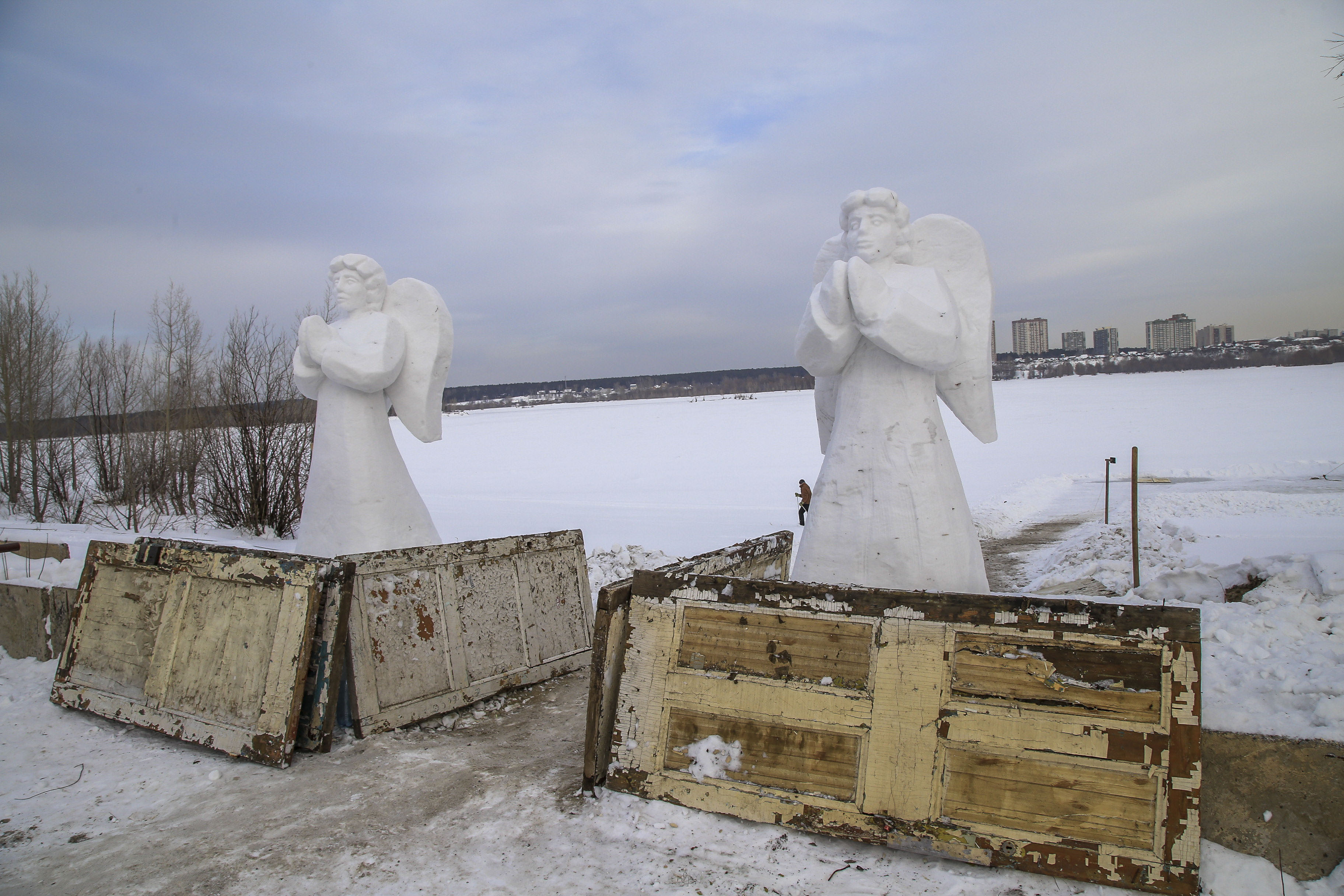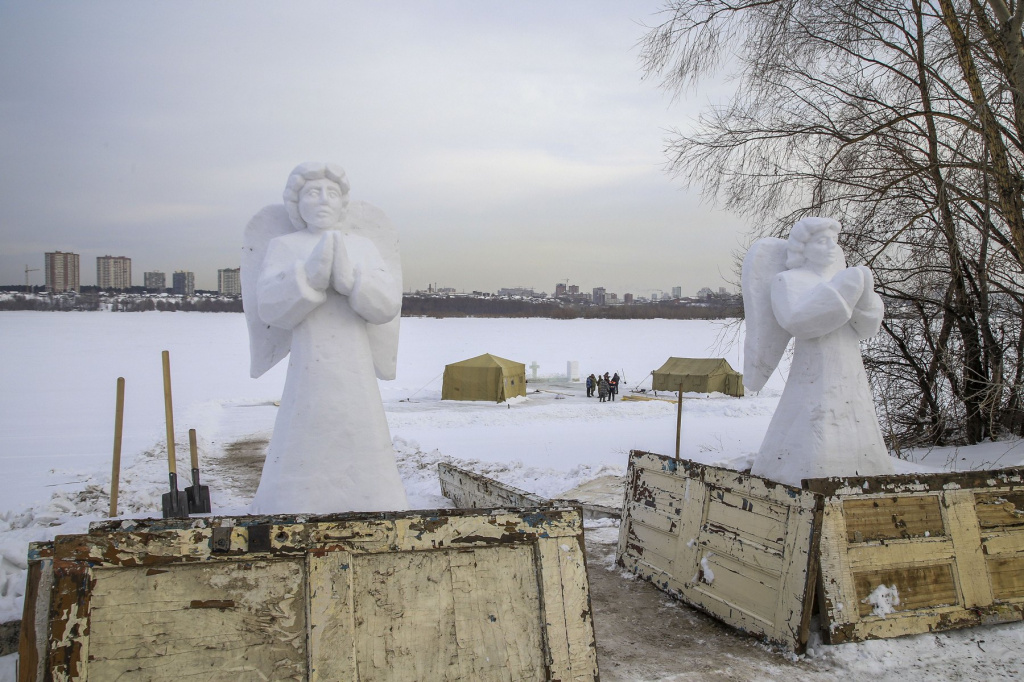 Ледяной крест и фигуры ангелов вырезали у крещенской купели на Затоне