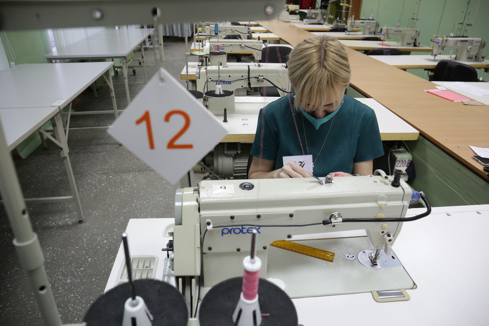 Перед началом — инструктаж и проверка оборудования. Участники должны выполнить работу за час и 20 минут. Сегодня обрабатывают низ рукава мужской сорочки. Ширина манжета должна быть одинаковой по всей длине, углы верхней планки — симметричными, строчки — ровными.