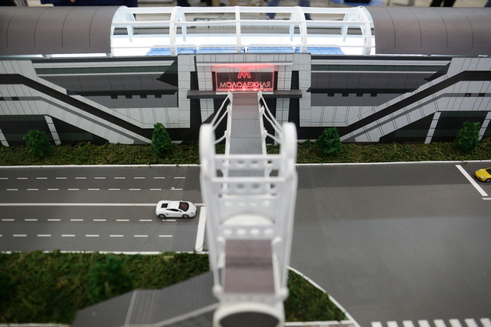Две новых станции и метродепо — так будет выглядеть продолжение Дзержинской ветки. От «Золотой Нивы» до станции «Гусинобродская» она запроектирована в подземных тоннелях, далее до «Молодёжной» — в надземном исполнении: на крытой эстакаде. Мэр Анатолий Локоть рассказывает о проекте помощнику президента РФ Игорю Левитину. Рядом — макет станции «Спортивная». Её запуск состоится уже этой осенью.