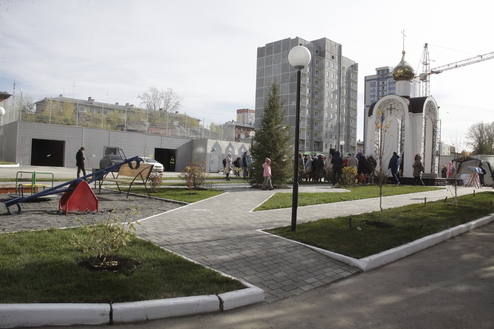 Из Ленинграда и области в наш город эвакуировали 128 000 человек. Сама улица Тихвинская была названа в честь Тихвина — небольшого городка в Ленинградской области. Рядом с новой часовней расположен небольшой сквер. На территории высадили кустарники, сделали газон и установили несколько качелей для детей.