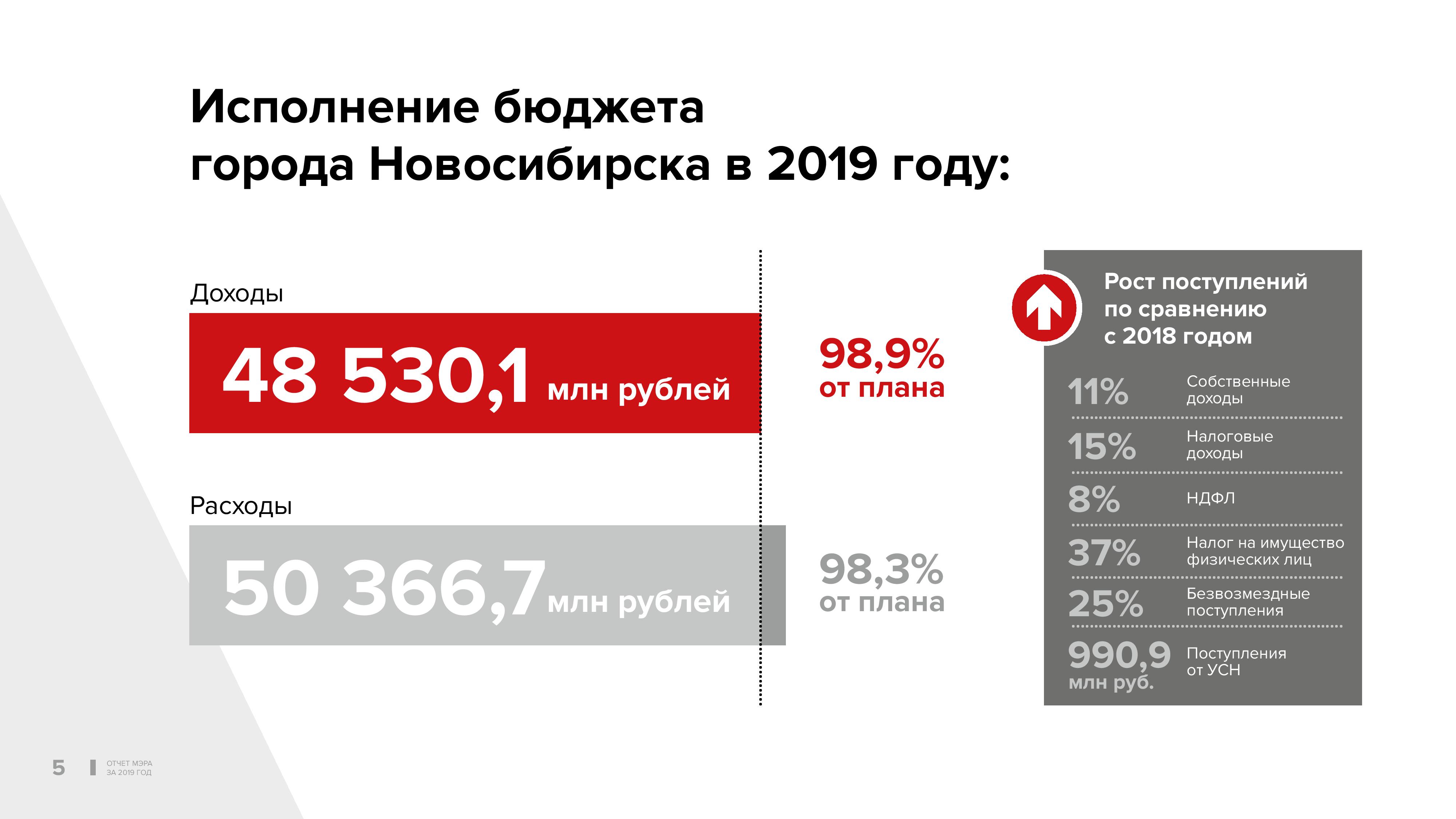 Особенность прошлого года заключается в том, что мы работали в условиях новых договорённостей субъекта Федерации и муниципалитета. Мы наращиваем сотрудничество в плане межбюджетных отношений. Новосибирск получил норматив отчислений по упрощённой системе налогообложения в размере 10%. Это дало нам дополнительно более 990 млн рублей — несколько меньше, чем мы рассчитывали, а мы рассчитывали на 1 млрд 100 млн. Но это весомая прибавка к бюджету нашего города. Причём ранее установленный срок действия норматива отменён, сегодня это бессрочный норматив, и мы можем вести плановую работу на следующий период. #SHOWMORE__328170#