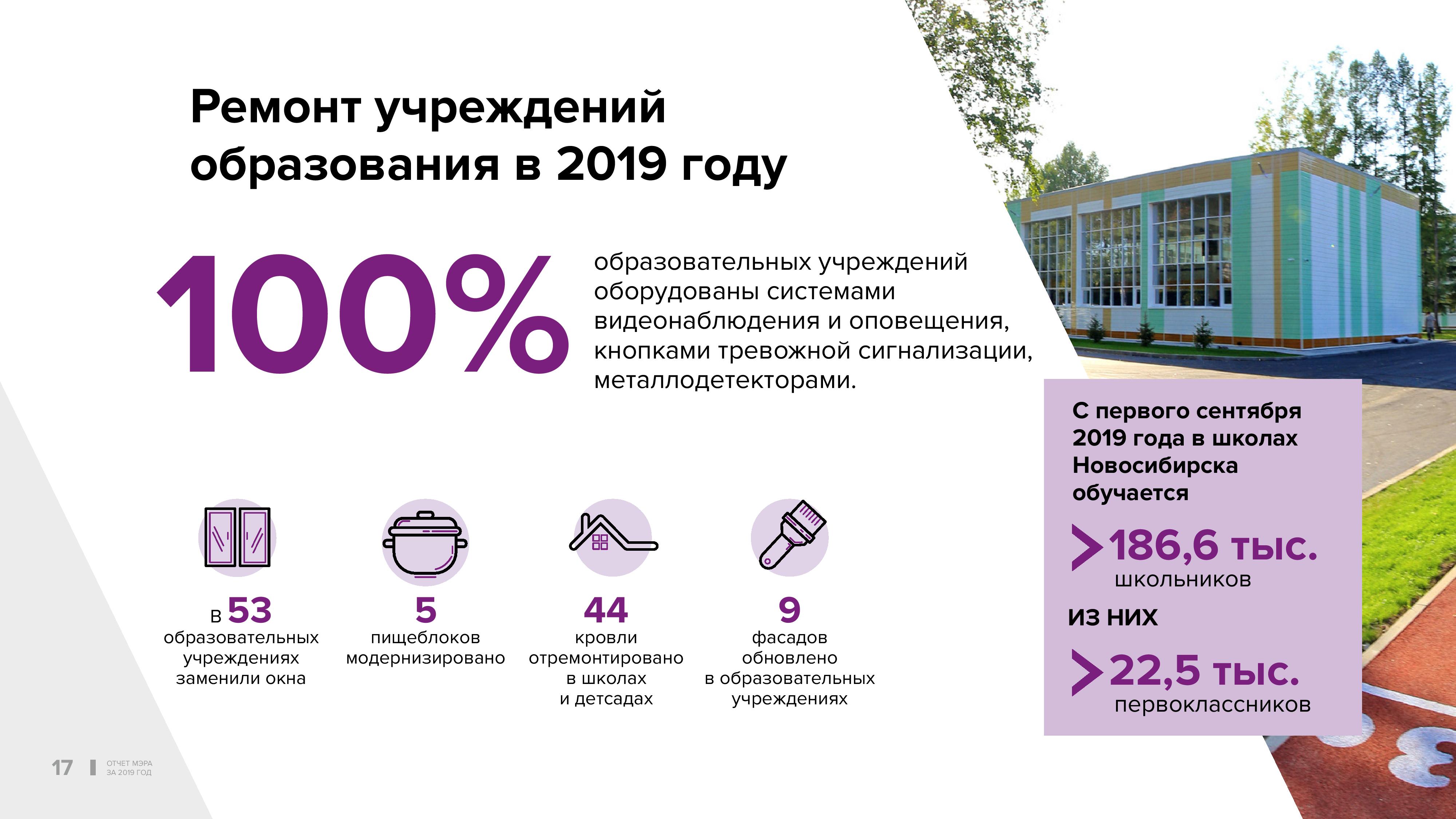 Социальная сфера — самая объёмная статья в бюджете города. Практически 70% расходов мы тратим на отрасль образования и социальную политику. В прошлом году в Новосибирске сданы 14 объектов образования: четыре школы и десять детских садов.
