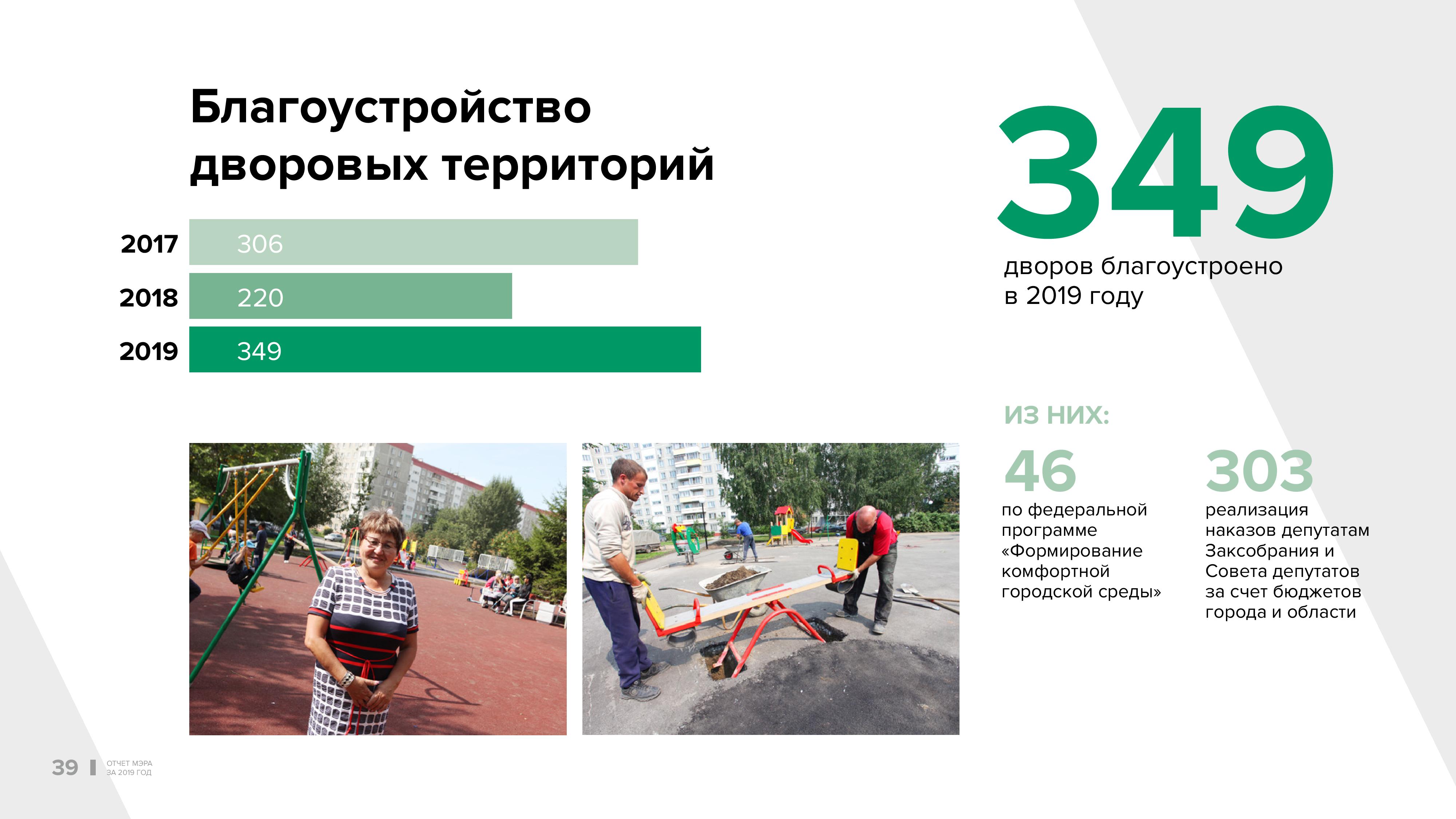 Благоустройство в прошедшем году коснулось многих уголков нашего города. В результате выделения средств из трёх бюджетов мы обновили 349 дворовых территорий. Это рекордная цифра за последние три года. Из них 46 дворов — по федеральной программе, и ещё 303 объекта — это реализация наказов депутатам Законодательного собрания и Совета депутатов города Новосибирска. За долгое время мы впервые отремонтировали лестницы. Мы годами не обращали внимания на эту проблему. Сегодня условия программы позволяют это делать. Мы обратились к лестничным переходам, и есть результаты. #SHOWMORE__327289#