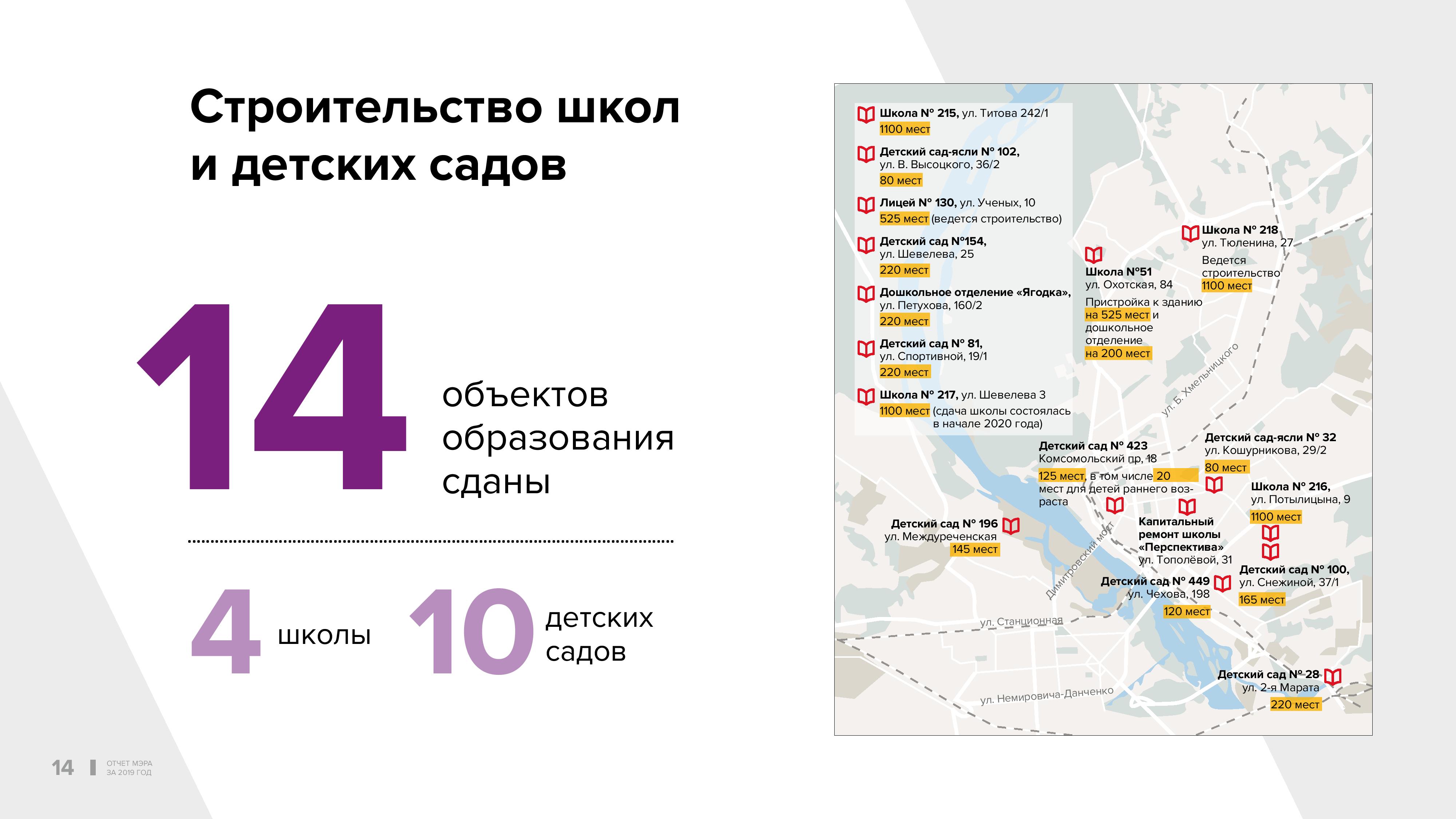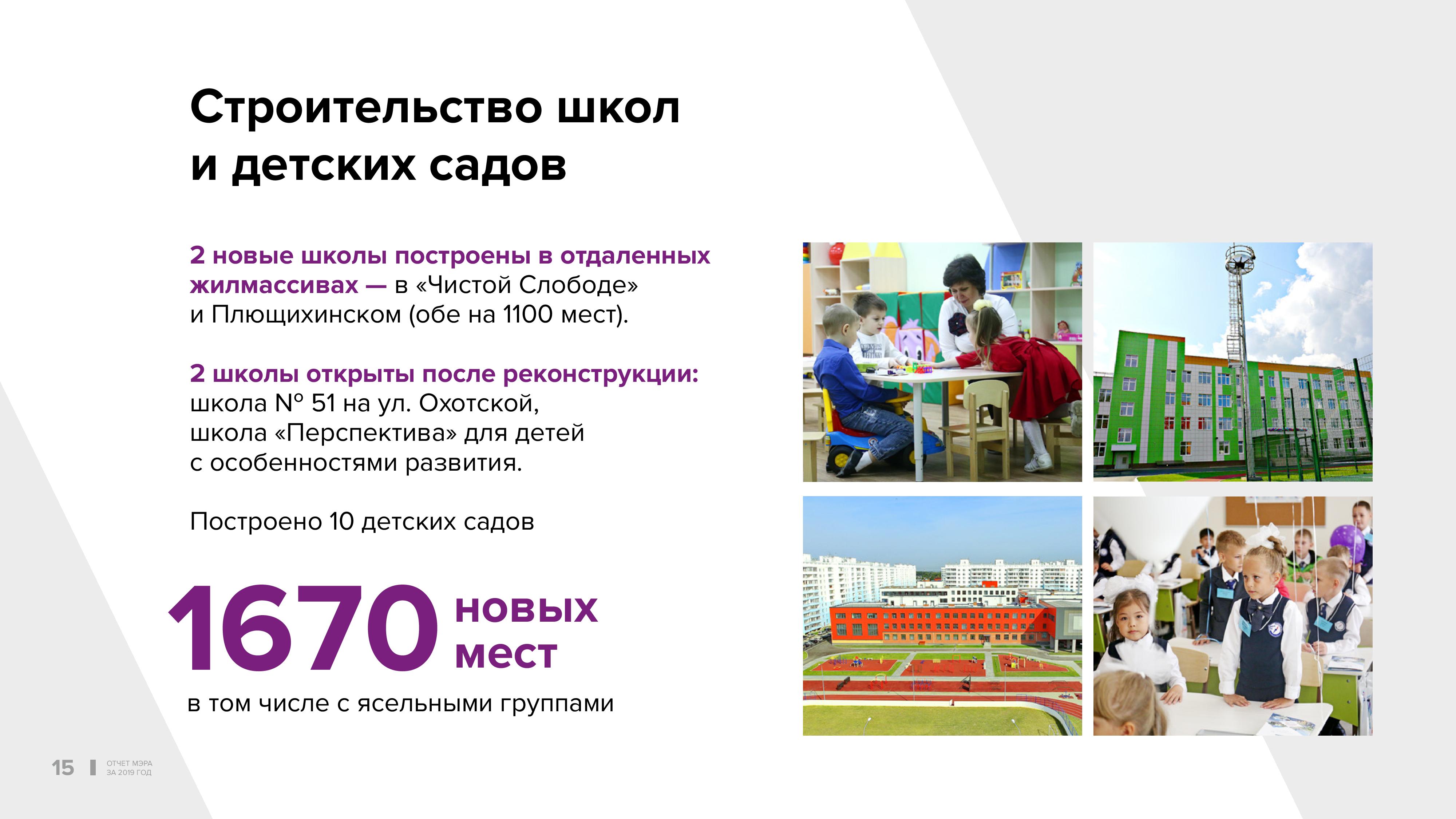 Две новых школы построены в отдалённых жилых массивах — в «Чистой Слободе» и на Плющихинском. Ещё две школы открыты после реконструкции: №51 на улице Охотской, включая новую пристройку, и школа «Перспектива» для детей с особенностями развития в Октябрьском. Это крайне важное направление. Даже возможности этой новой школы, которые по сравнению со старым зданием увеличились в разы, сегодня не обеспечивают всех потребностей. Ко мне идёт поток родителей, которые просят уделять внимание этой проблеме дальше.