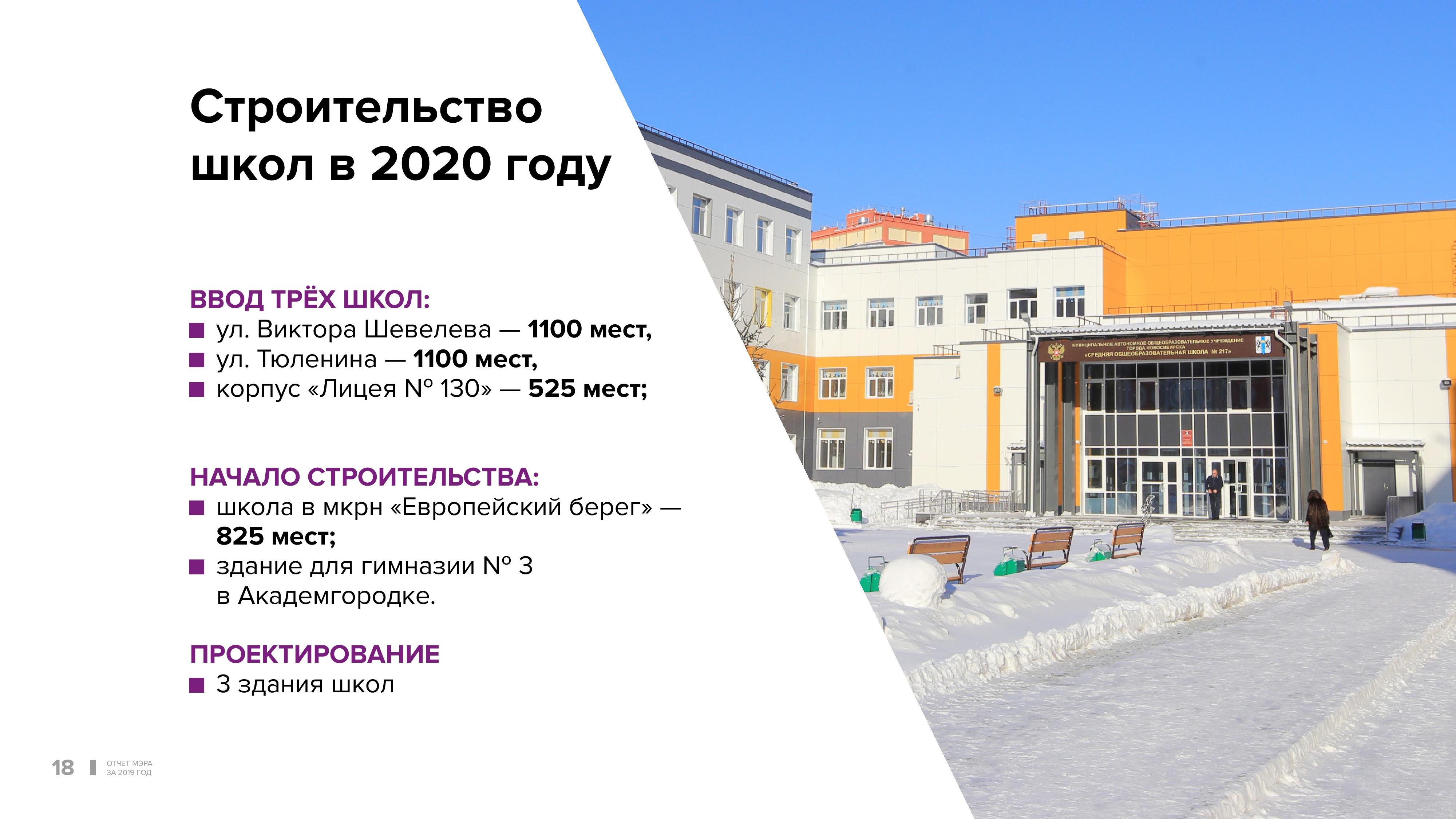 Строится новая школа в микрорайоне «Родники». В этом году также введём пристройку к лицею №130 в Советском районе, это будет фактически новая школа. Начнём строить школу в микрорайоне «Европейский берег» и здание для гимназии №3 в Академгородке, заканчивается разработка проекта по лицею №185 в Октябрьском районе, он находится в тревожном техническом состоянии.