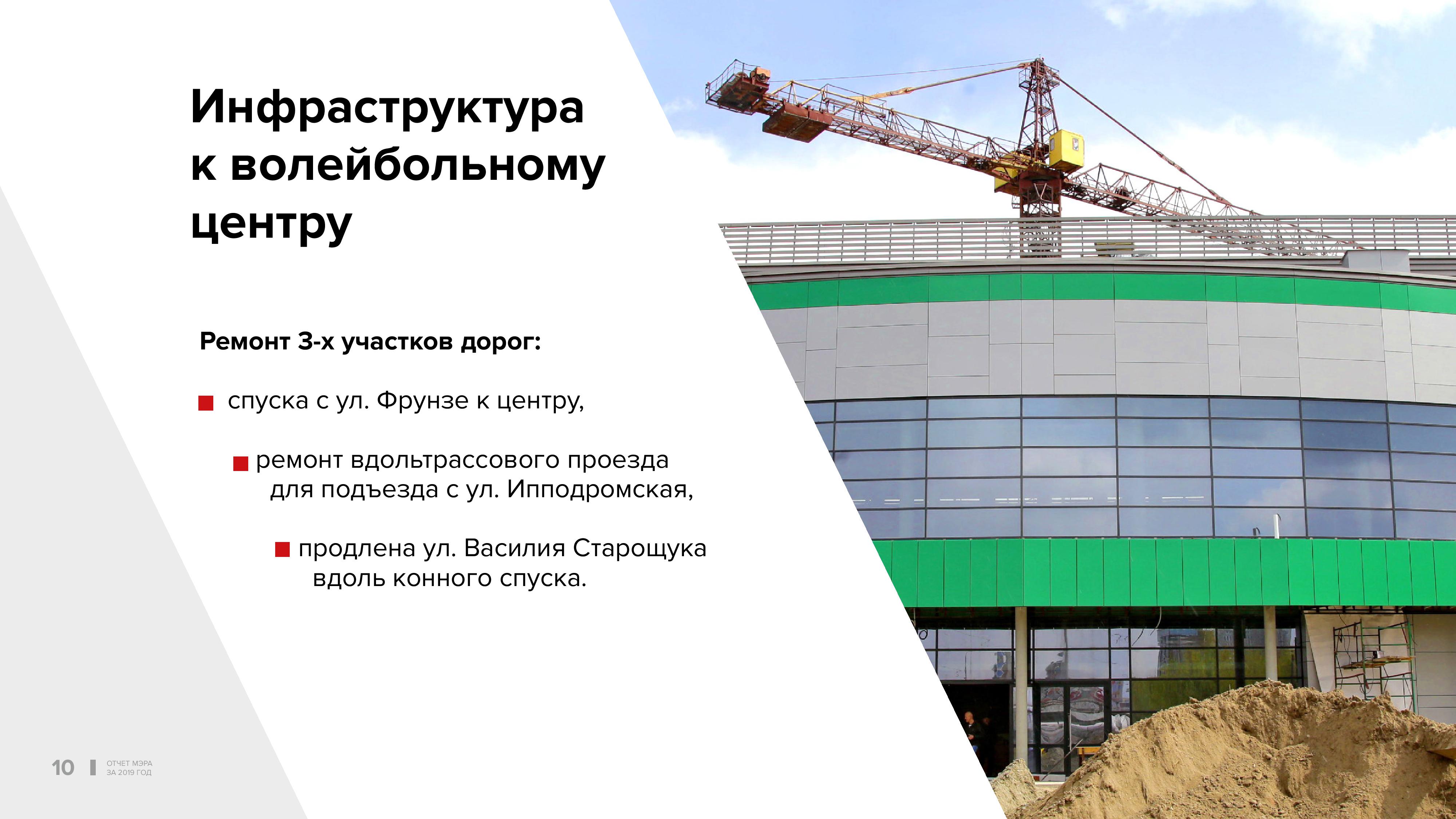 Строятся дороги и развязки для доступа к волейбольному центру. Отремонтировали спуск с улицы Фрунзе, проезд с улицы Ипподромской. Продлили улицу Василия Старощука вдоль конного спуска. Это позволит в дальнейшем соединить улицу Богаткова напрямую с волейбольным центром. Скорректированы маршруты общественного транспорта.
