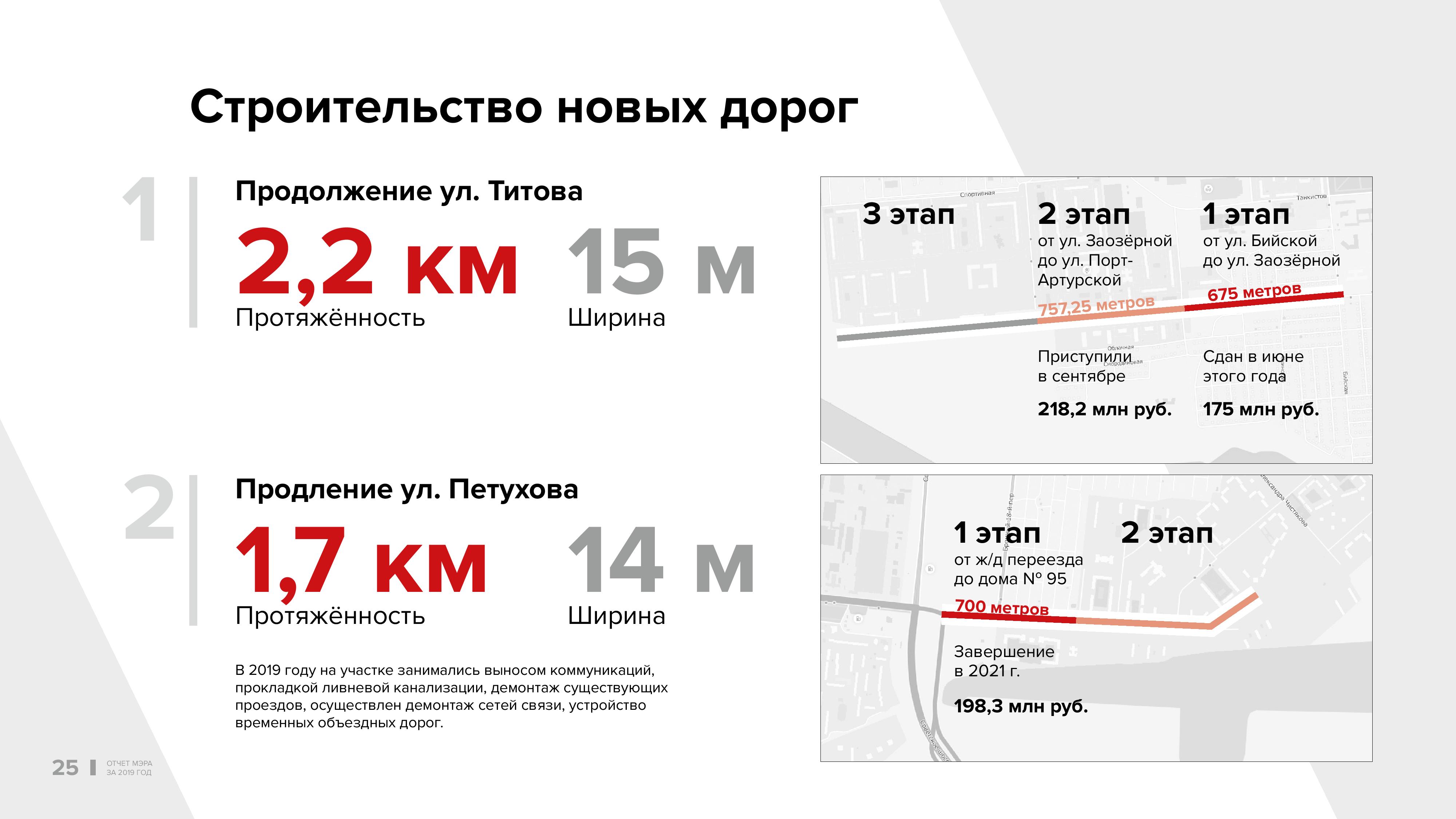 По этому нацпроекту мы сделали семь дорог: это участки улиц Жуковского, Гоголя, Фрунзе, Фабричной, Большевистской, Бердского шоссе и Красного проспекта, включая тротуары и прилегающие газоны. Впервые в прошлом году по национальному проекту мы приступили к реконструкции трёх выездов из города — на Гусинобродском шоссе, улицах Кедровой и 2-й Станционной. Работы продолжатся в этом году.