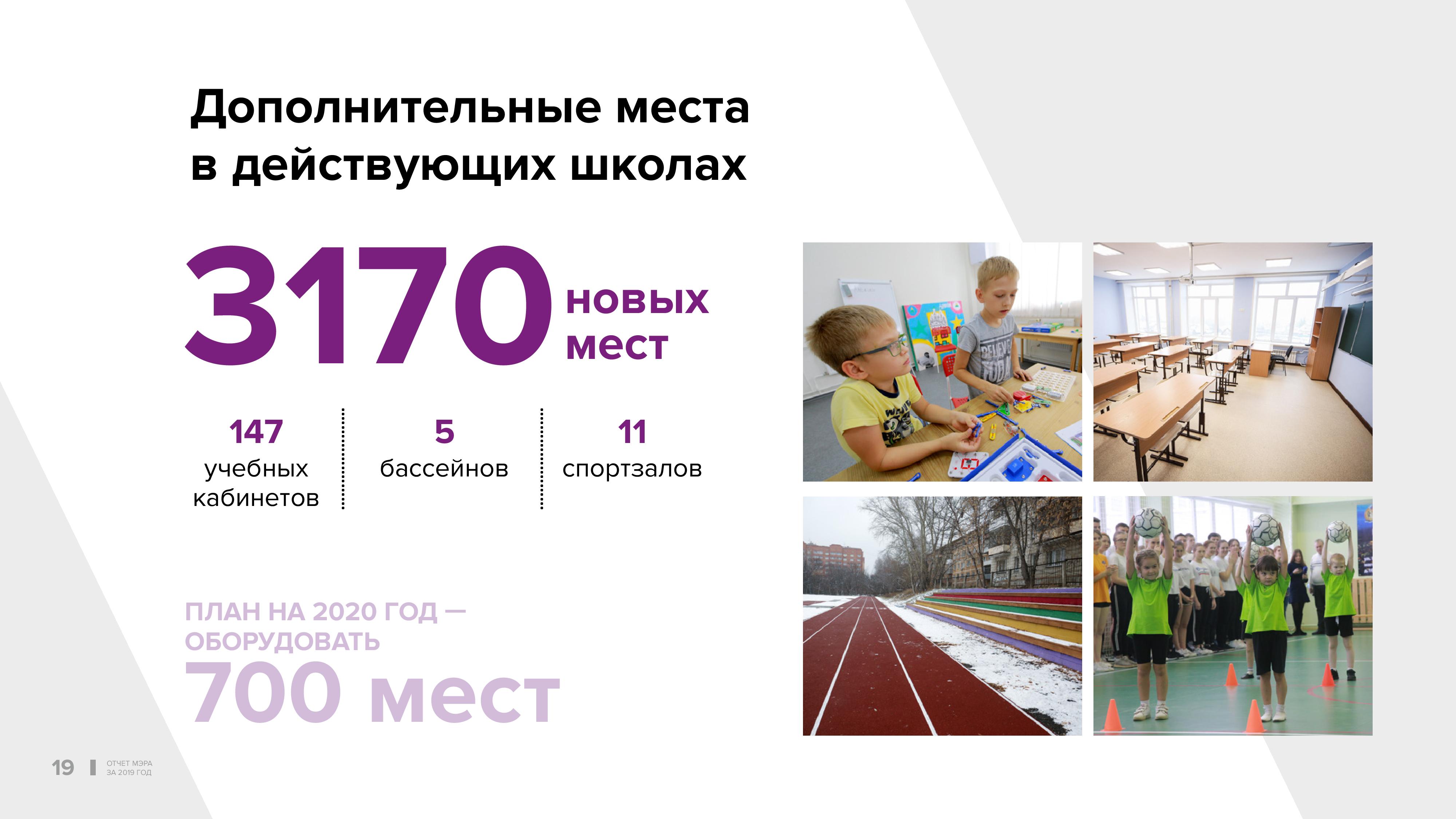 Причём стоимость одного места — в десять раз меньше, чем если бы строили здания новых школ, и это не преувеличение. Ровно в десять раз. Эту работу надо продолжать. Планируется создать ещё 700 мест при условии поддержки Законодательного собрания. Прошу поддержать это начинание и внести поправки в бюджет.