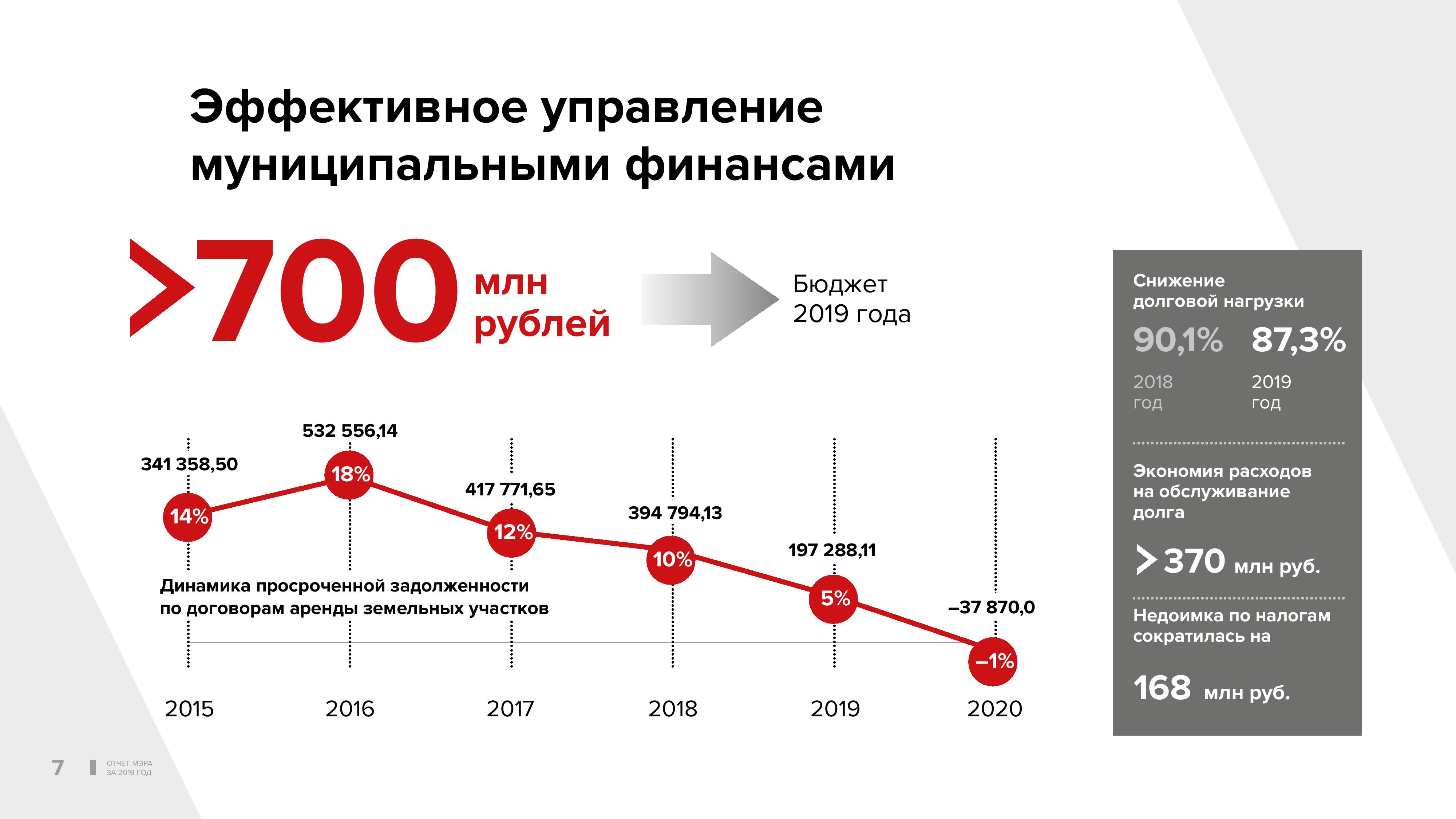 В управлении муниципальными финансами в прошлом году мы добились хороших результатов. Снижена долговая нагрузка по сравнению с предыдущим годом. Более 370 млн рублей сэкономили на обслуживании долга. Это крайне важный результат. Впервые за последние годы остановлен рост задолженности по текущим платежам аренды за землю и муниципальное имущество.