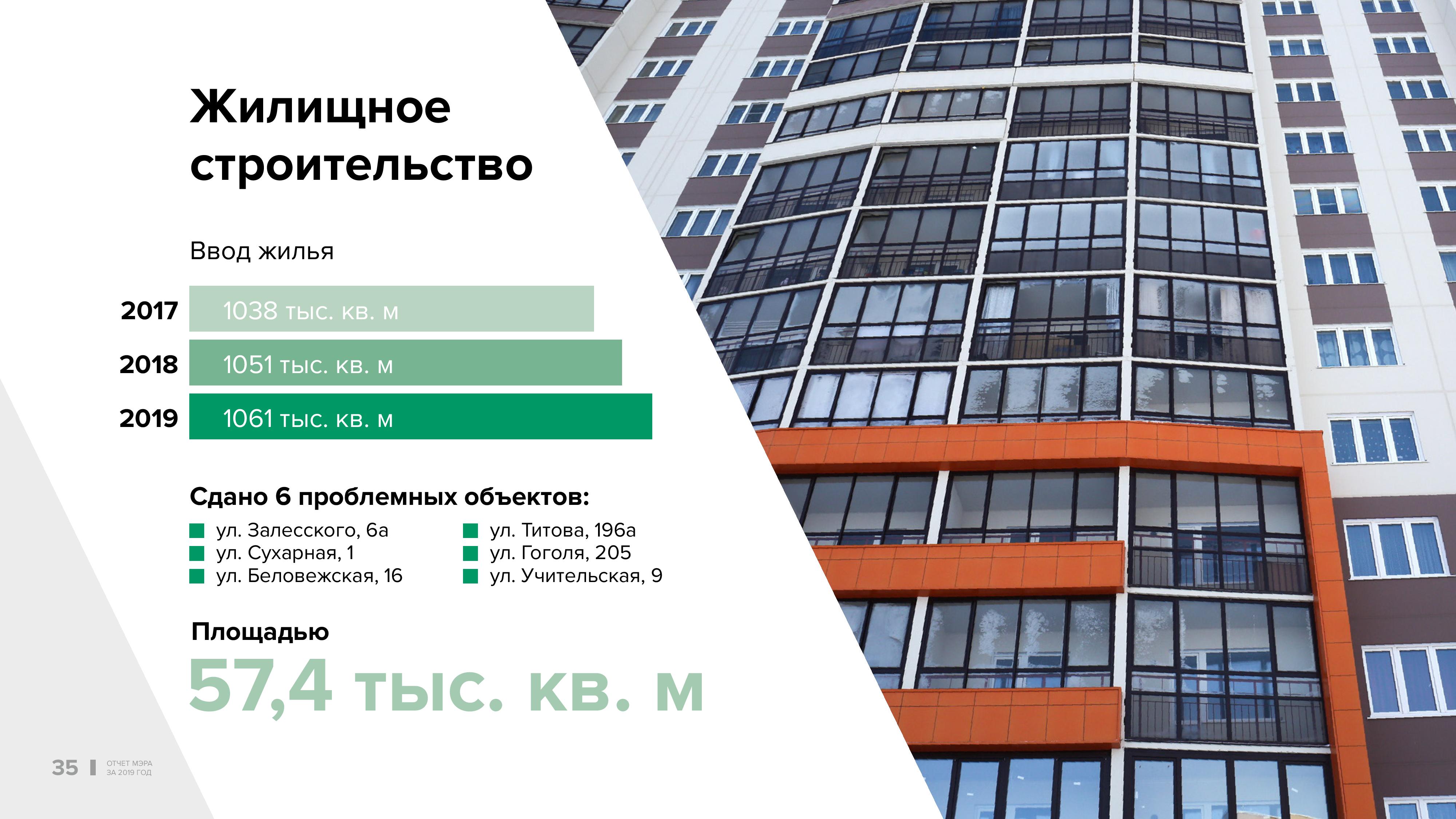 В городе сохраняются хорошие темпы жилищного строительства. За год введены в эксплуатацию 1 млн 61 тысяча кв. м жилья. В том числе решена проблема шести долгостроев. По количеству это немного, но общая площадь этих домов сопоставима с количеством площадей, открытых в 2017 году, когда было введено 12 объектов. Также в прошлом году выработаны решения ещё по пяти проблемным домам. Тем не менее, задача решения этой проблемы остаётся актуальной на следующий период.