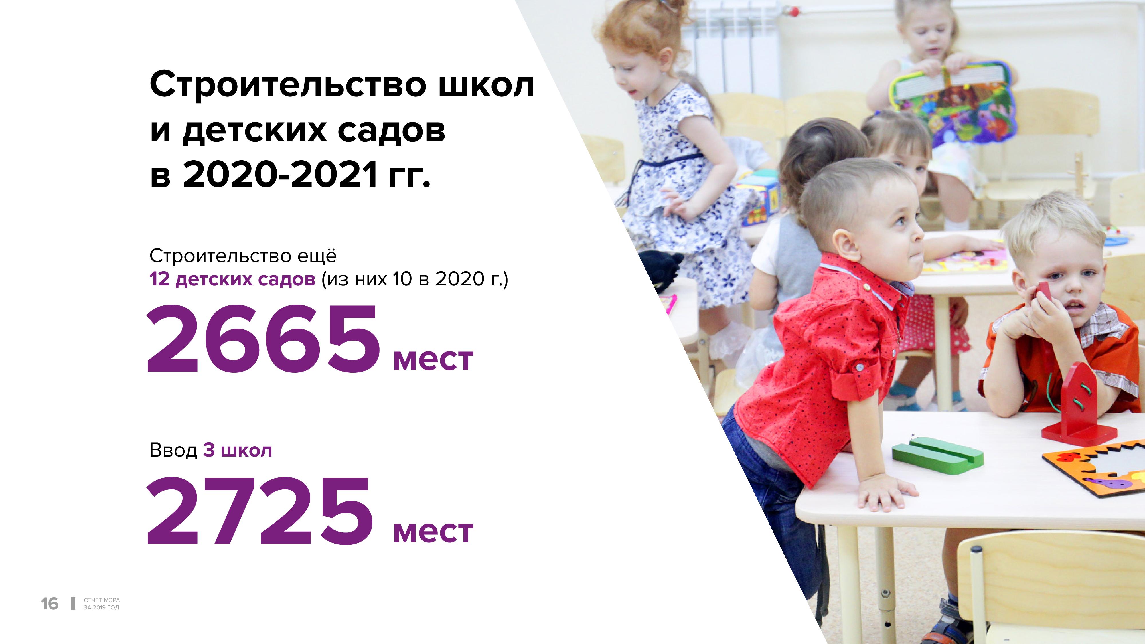 В ближайшие два года мы введём ещё 12 детских садов, из них десять уже в этом году. Завершим строительство трёх новых школ, одну из них мы вместе с депутатами Кировского района открыли 11 февраля, школа на 1100 мест.