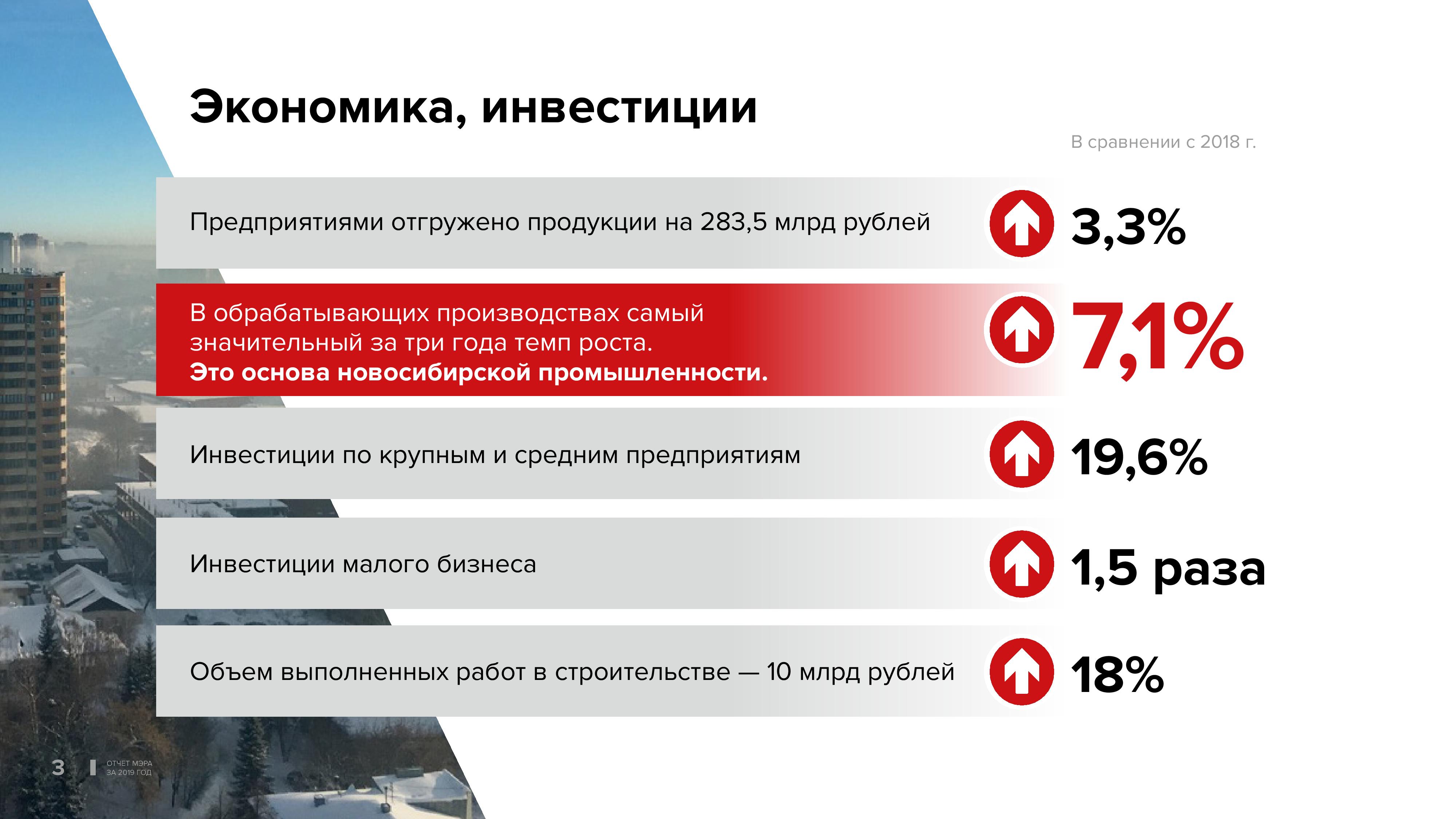Хочу привести положительные примеры развития экономики города. Во-первых, в обрабатывающих производствах за минувший период произошёл прирост на 7% — самый высокий за последние три года. Средние темпы роста промышленности сохраняются. Очень важно, что после всех изменений законодательства на федеральном уровне строительная отрасль на нашей территории оправилась и набирает темпы. Она дала прирост на 18%. Второй год повышается инвестиционная активность крупных и средних предприятий. Инвестиции малого бизнеса выросли почти в полтора раза.