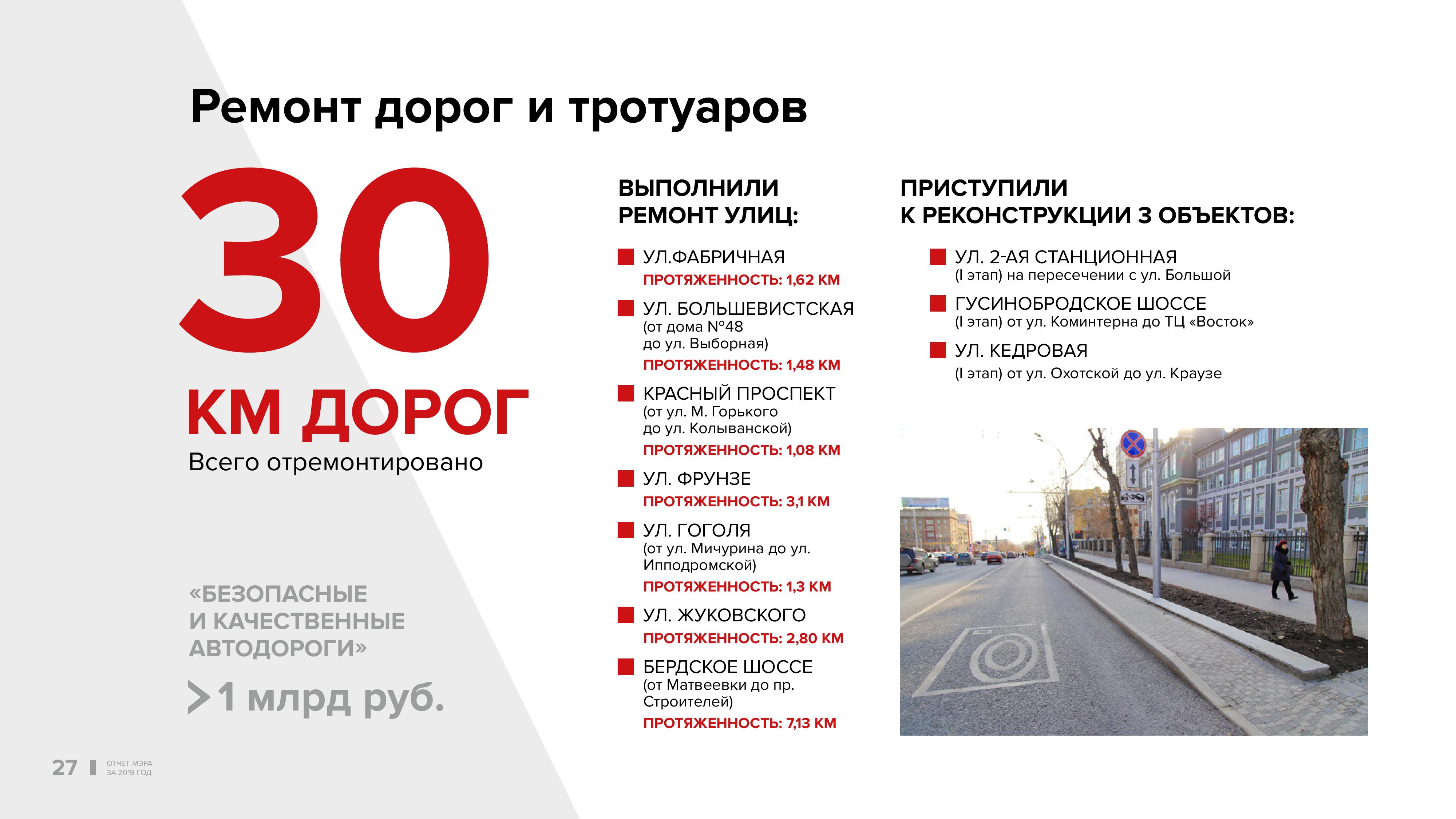 Третий год участвуем в реализации национального проекта «Безопасные и качественные автомобильные дороги» (БКАД). За прошлый год в Новосибирске отремонтировано 30 километров дорог с учётом городских программ. Самый главный результат, который мы имеем: число ДТП в городе последовательно снижается. За этот период оно сократилось на 30%.