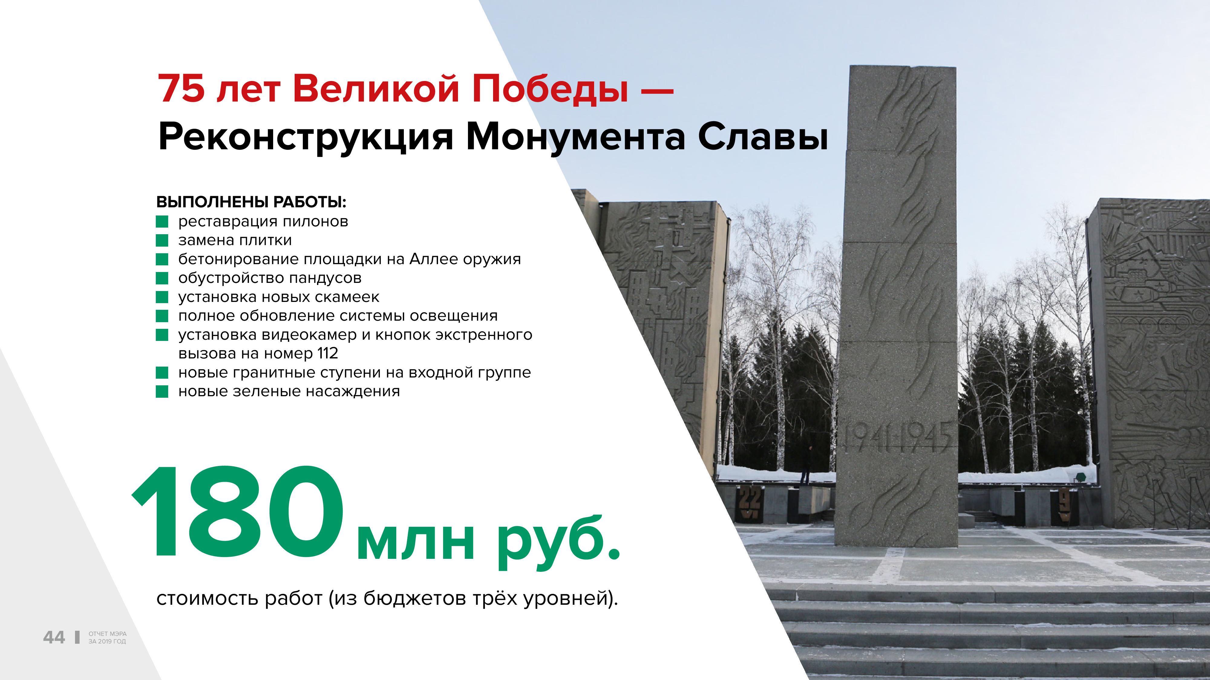 Главным проектом благоустройства в прошлом году, без всякого преувеличения, стали Монумент и сквер Славы сибиряков, отдавших жизнь за свободу нашей Родины. Это наша гордость, это наша боль, это наша дань истории, ветеранам. Мы выполнили наказ наших ветеранов. Проведён огромный комплекс работ на сумму 180 млн рублей. Здесь не только возможности федерального бюджета, здесь поддержка областного бюджета, понимание губернатора и областных депутатов, что это главный объект Новосибирской области. Здесь и участие нашего городского бюджета. К 9 Мая мы должны закончить, внести последние штрихи. Надо доработать, справиться с этой задачей.