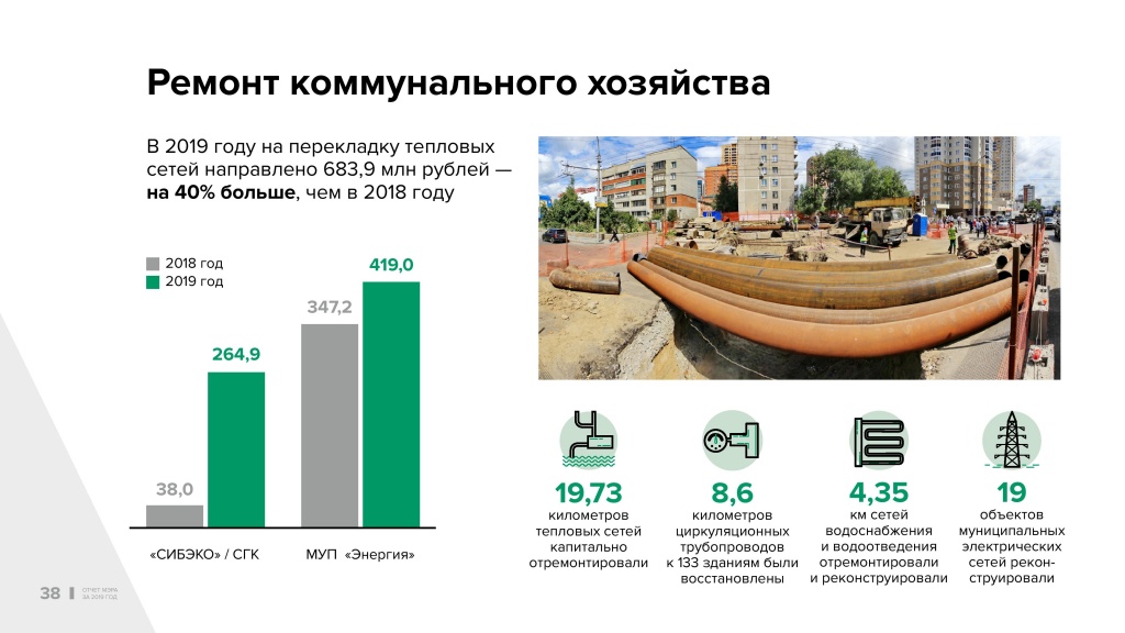 Сумма вложений в эту отрасль в прошлом году выросла на 40% по сравнению с 2018 годом. Но и этого не достаточно, надо делать рывок в решении этой проблемы. Об этом говорят аварии в ноябре, которые произошли в городе, когда мы входили в зимний режим отопления. Поэтому мы должны предпринимать меры для того, чтобы резко увеличить финансирование, объёмы ремонта и подготовки к зиме.
