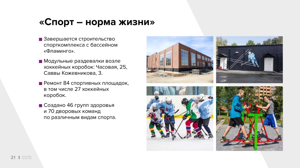Уделяется внимание развитию дворового спорта: по инициативе депутатов оборудованы многие площадки, тёплые помещения, раздевалки, хоккейные коробки. Завершается строительство бассейна «Фламинго» в Кировском районе. Задача стоит, чтобы в первом квартале он принял своих первых посетителей. Ведётся большая работа, чтобы занятия физкультурой и спортом в Новосибирске приняли массовый характер.