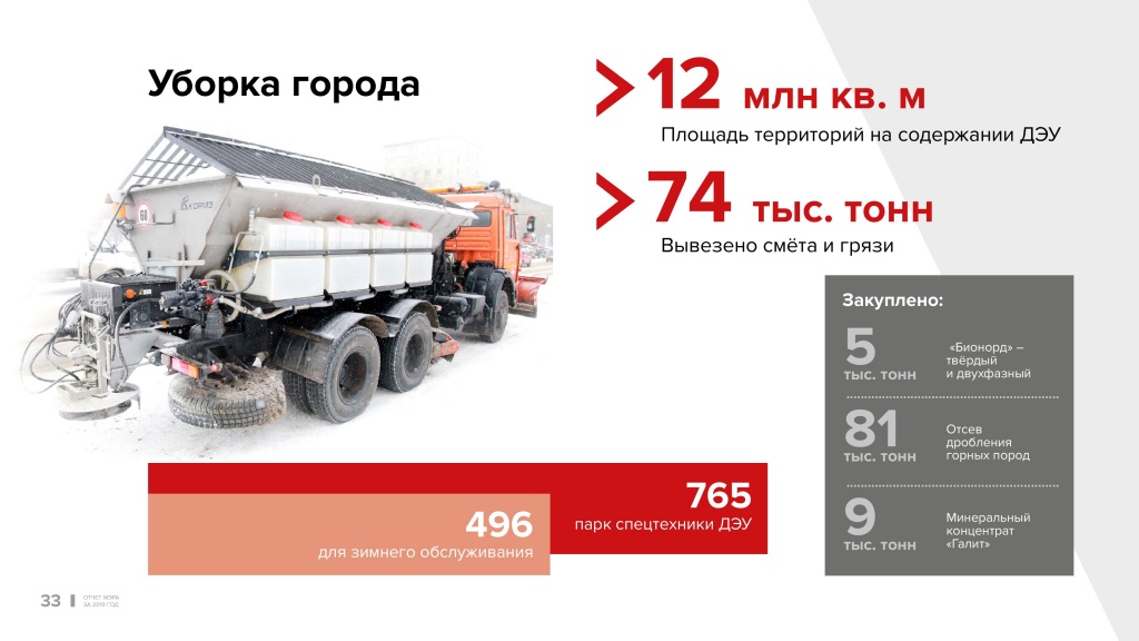 По результату зимнего содержания: количества техники, которое у нас есть, не хватает, чтобы поспевать за уборкой в столь обильные снегопады. Поэтому я вынужден был объявить режим ЧС, он продолжается. Это позволило нам увеличить в два раза группировку техники, в два раза увеличить вывоз снега с территории города. Эту задачу надо выполнять дальше, потому что вывоз снега — это не только зимнее содержание дорог, улиц и дворов. Это противопаводковые мероприятия. Очень важная задача.