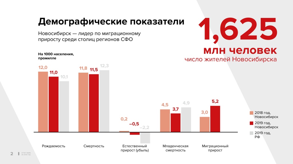 Ряд демографических показателей в Новосибирске лучше, чем в среднем по России. Но, конечно, общие негативные тенденции нас не обошли. Последние четыре года в городе снижается уровень рождаемости. В 2019 году естественный прирост населения впервые за последние десять лет сменился убылью. Но в то же время город остаётся лидером среди сибирских столиц по миграционному притоку. У нас были положительные цифры по миграции, но в течение семи лет сальдо снижалось. В прошлом году произошёл резкий скачок, и миграционный поток по сравнению с 2018 годом увеличился в два раза. В результате число жителей города составило 1 млн 625 тысяч человек. То есть у нас общий прирост населения, и эта тенденция продолжается и набирает темпы.