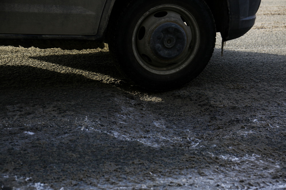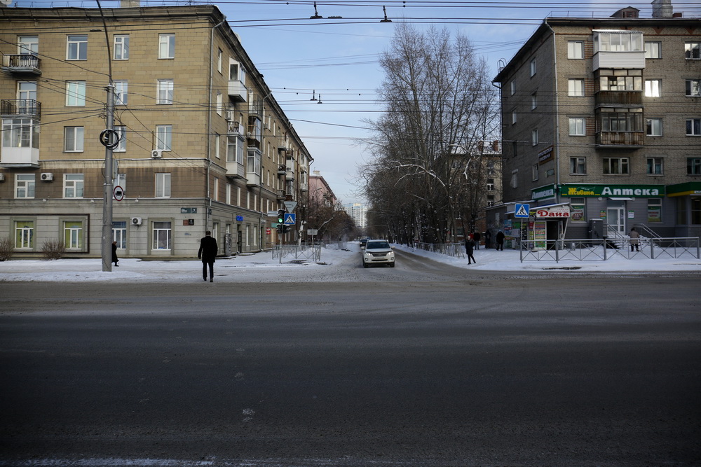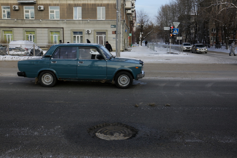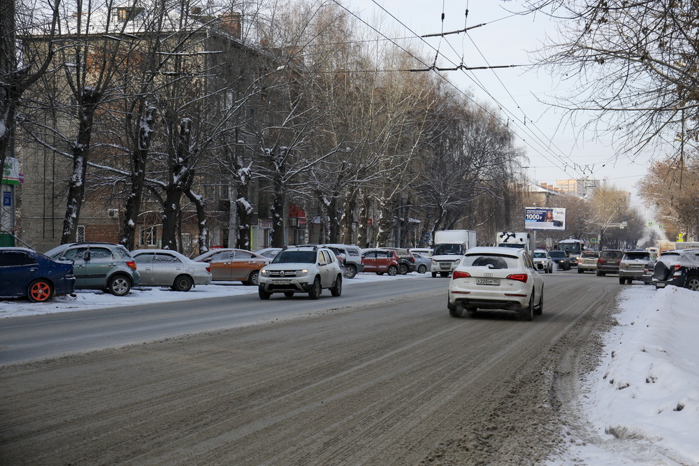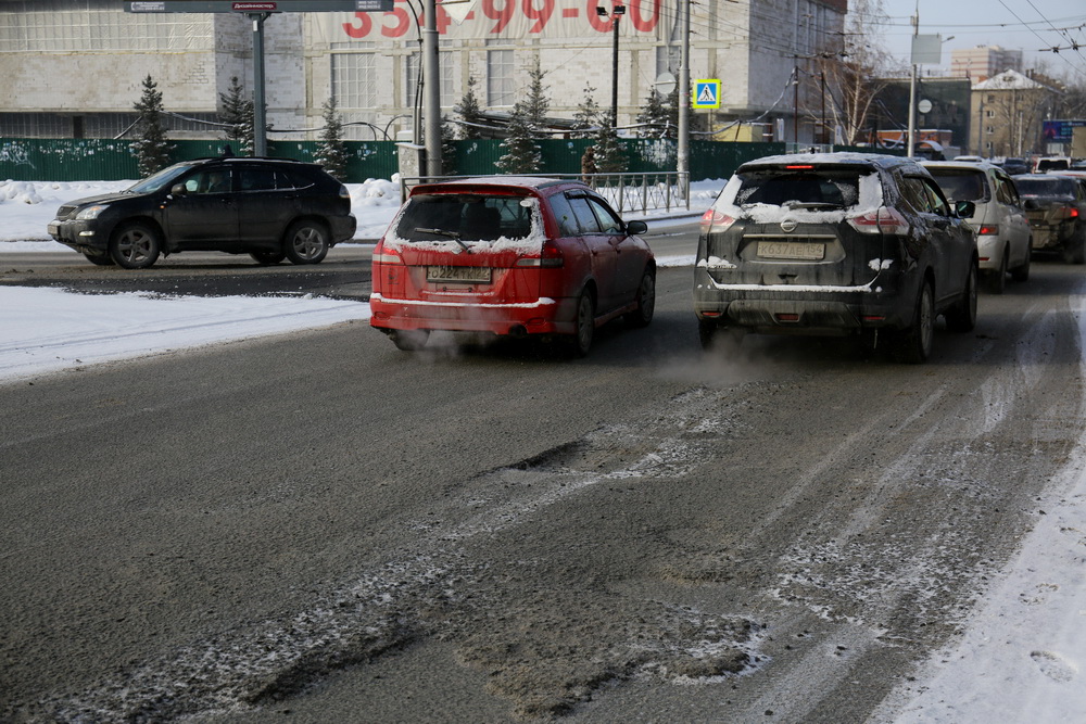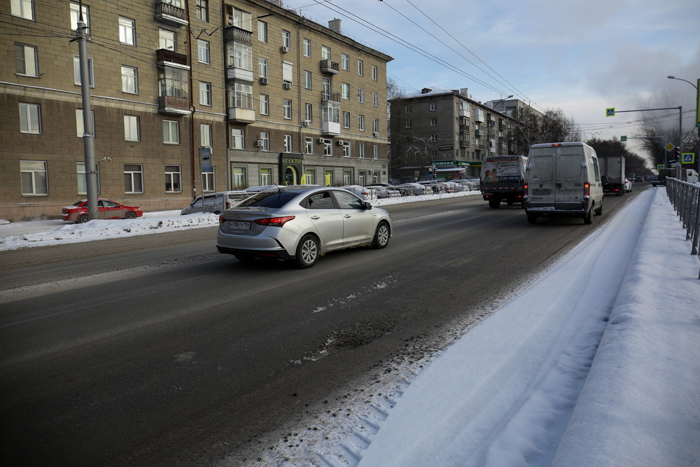 А вот и последствия того самого снежного ремонта. Выравнивающий слой, улица Ватутина возле стадиона «Сибсельмаш». Сейчас сколотый асфальт подзакатало снежком. Но в дождь видно: это довольно-таки большие выбоины. Подрядчику придётся сюда вернуться и провести работу над ошибками — уже за свой счёт.