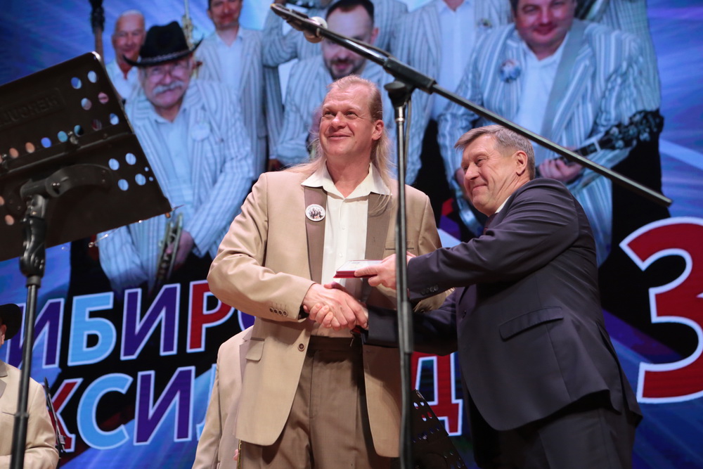 Вечером во вторник, 15 ноября, в новосибирской филармонии состоялся праздничный концерт, посвящённый 35-летию джаз-оркестра «Сибирский диксиленд». Поздравить легендарный коллектив пришёл мэр Новосибирска Анатолий Локоть. Он вручил юбилярам награды за выдающиеся успехи — почётную грамоту для оркестра и памятные знаки его участникам.