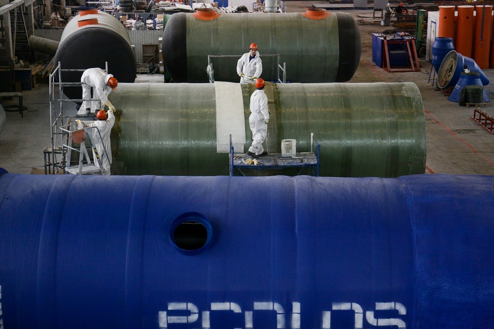 Стекловолокно наносят на корпус ёмкости: это основа для локальных очистных сооружений. С помощью такой технологии они прослужат около полувека. Чтобы полностью изготовить один резервуар, нужно около трёх дней.