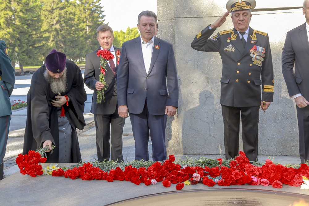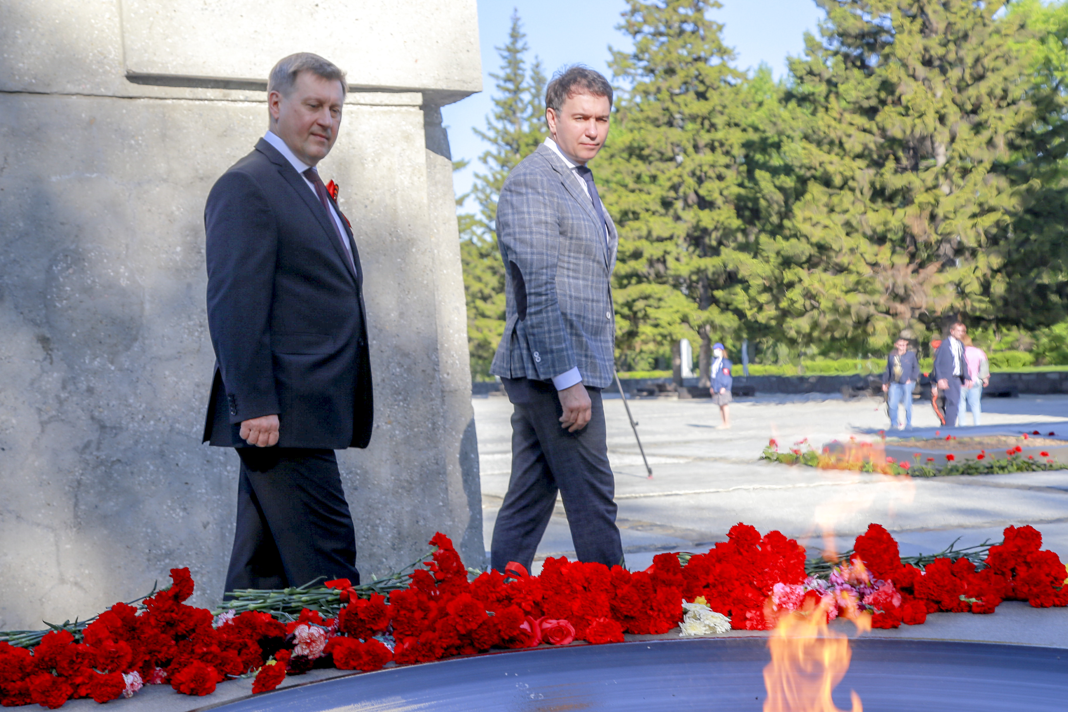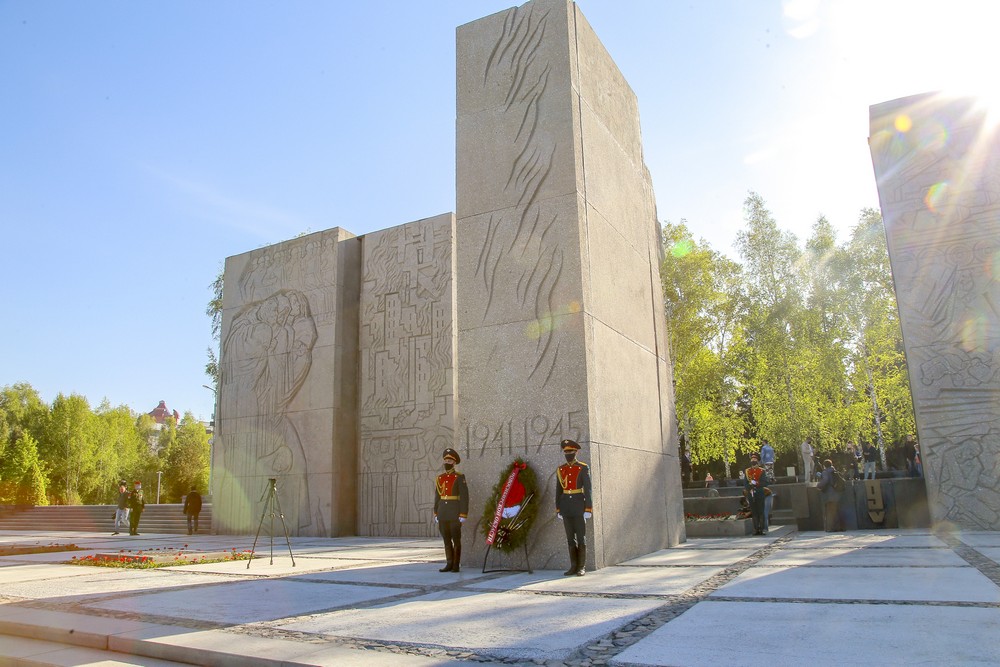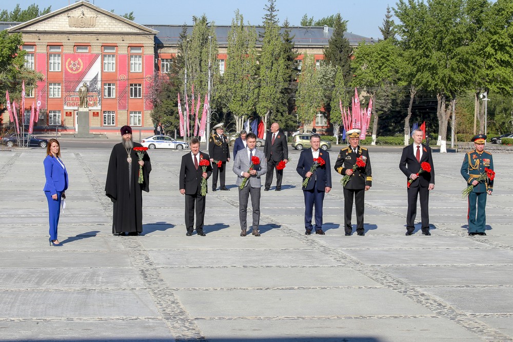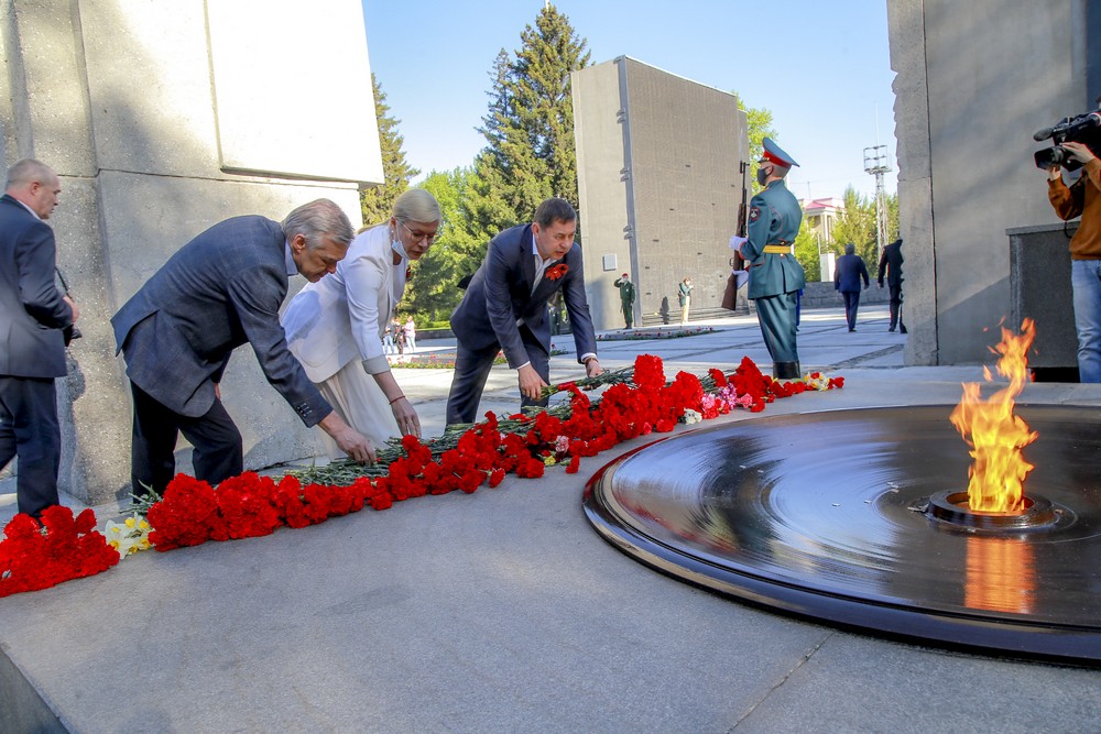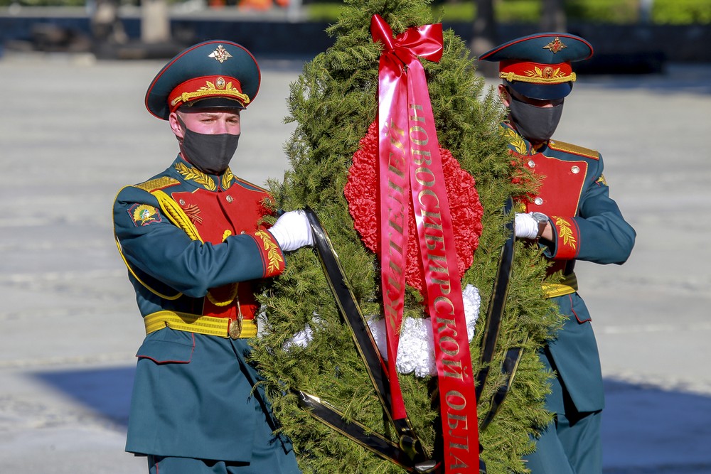 Мэр Новосибирска Анатолий Локоть вместе с губернатором Андреем Травниковым и другими официальными лицами почтил память павших сибиряков на недавно отреставрированном Монументе Славы 9 мая.