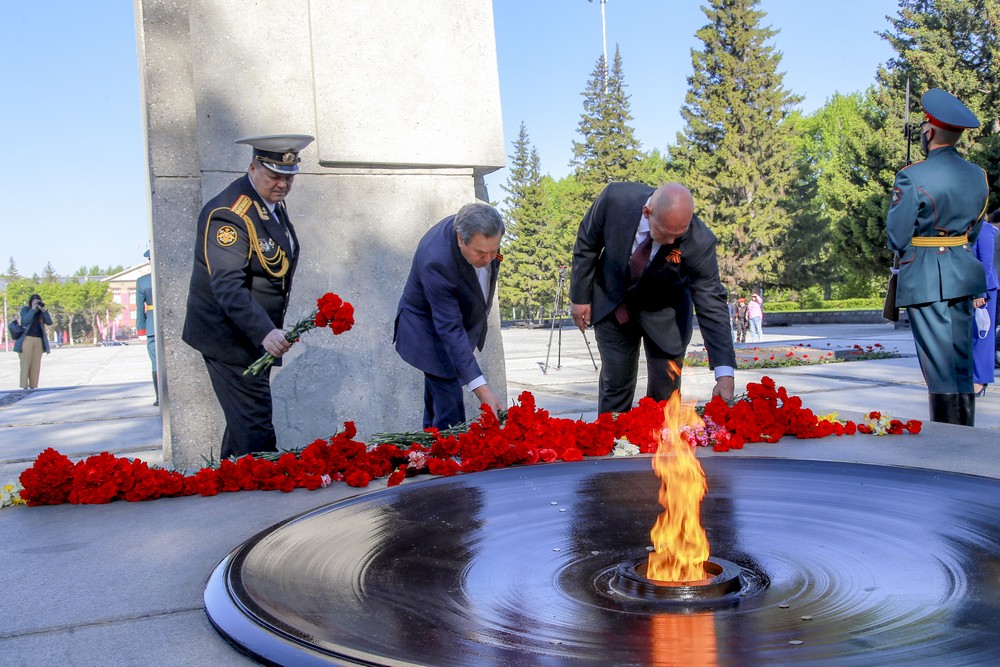 Вместе с мэром и губернатором цветы к Вечному огню возложили митрополит Никодим, председатель законодательного собрания региона Андрей Шимкив и председатель совета депутатов Новосибирска Дмитрий Асанцев.