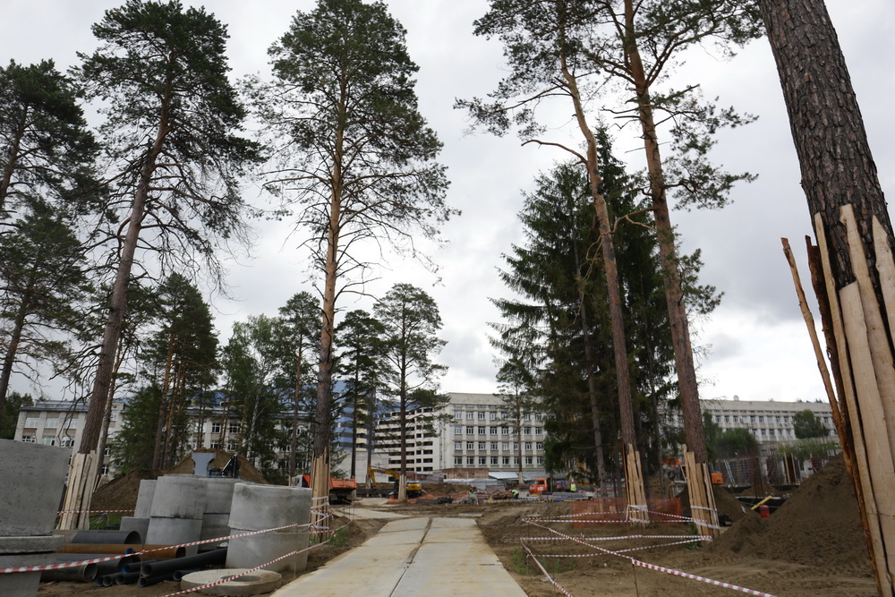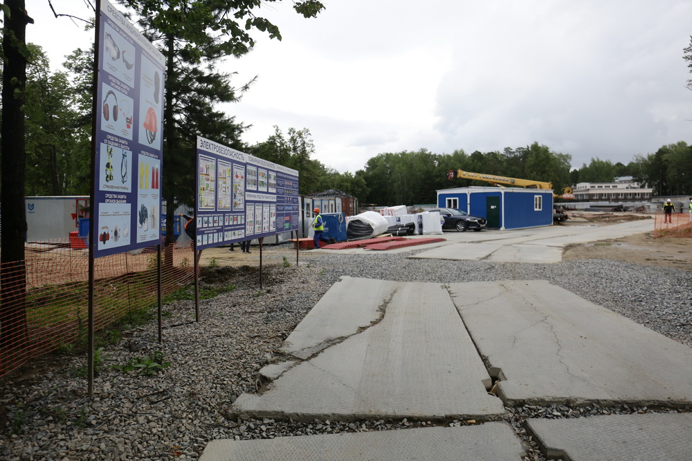 Важная задача при строительстве — сохранить зелёные насаждения. Часть молодых хвойных пересадили. Деревья, растущие на стройплощадке, защищали специальными кожухами.