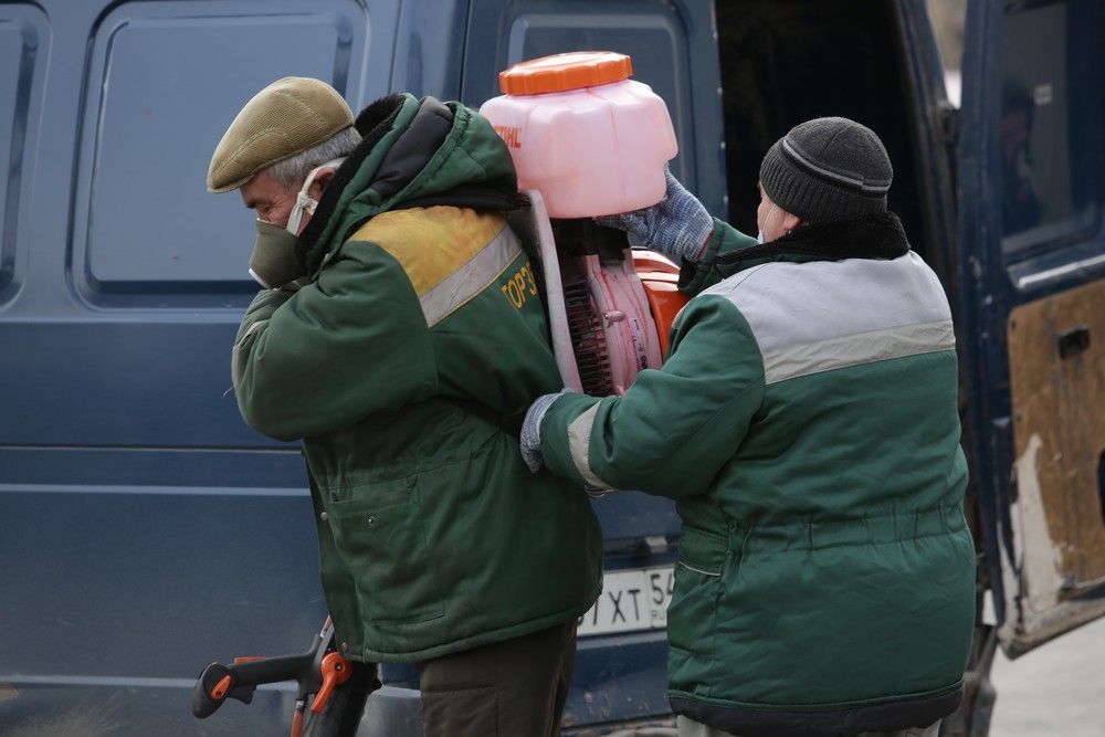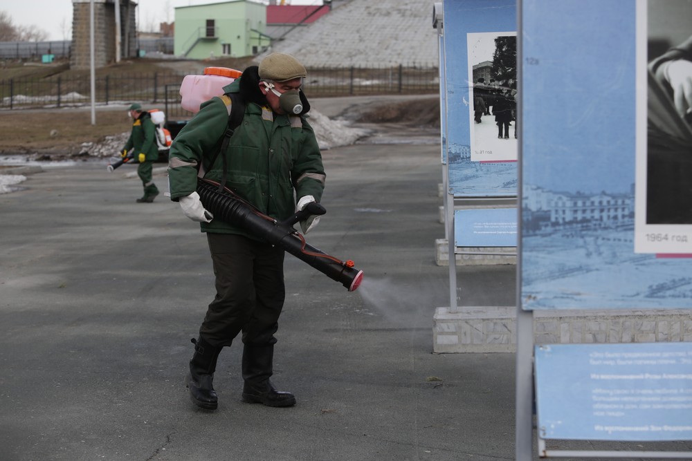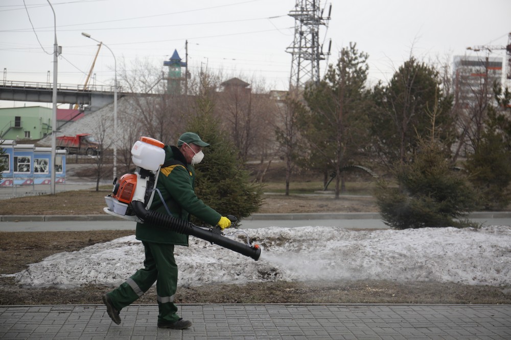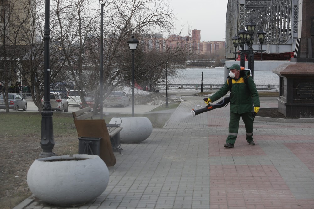Бригада рабочих новосибирского «Горзеленхоза» напоминает охотников за привидениями. На плечах — рюкзак с пластиковой трубой. Метр за метром они дезинфицируют поверхности на Михайловской набережной.
