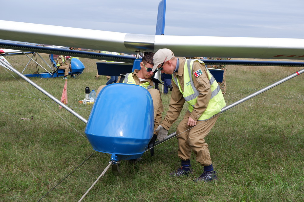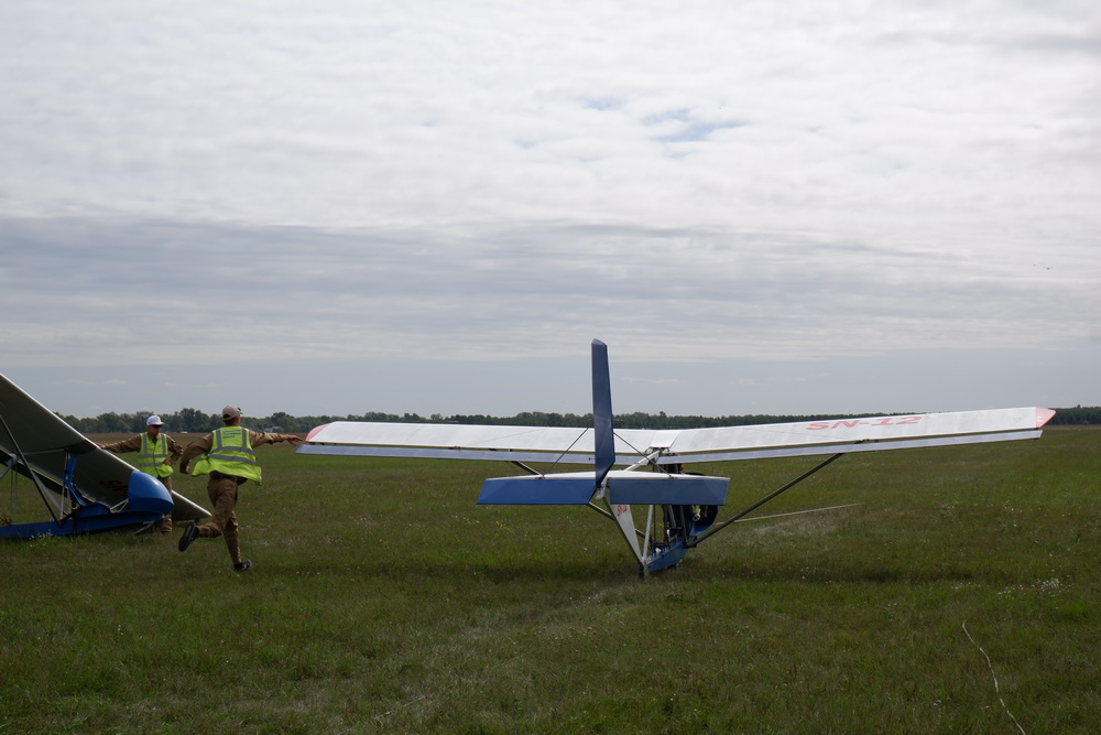 Экипажи — группы по шесть человек. Они готовят к полёту не только планер — собирают всю систему старта: в нужных местах на длинных кольях фиксируют ролики для натяжения тросов, которые потом потянут на разбег летательный аппарат. Правильно наматывают и закрепляют сами эти тросы.
