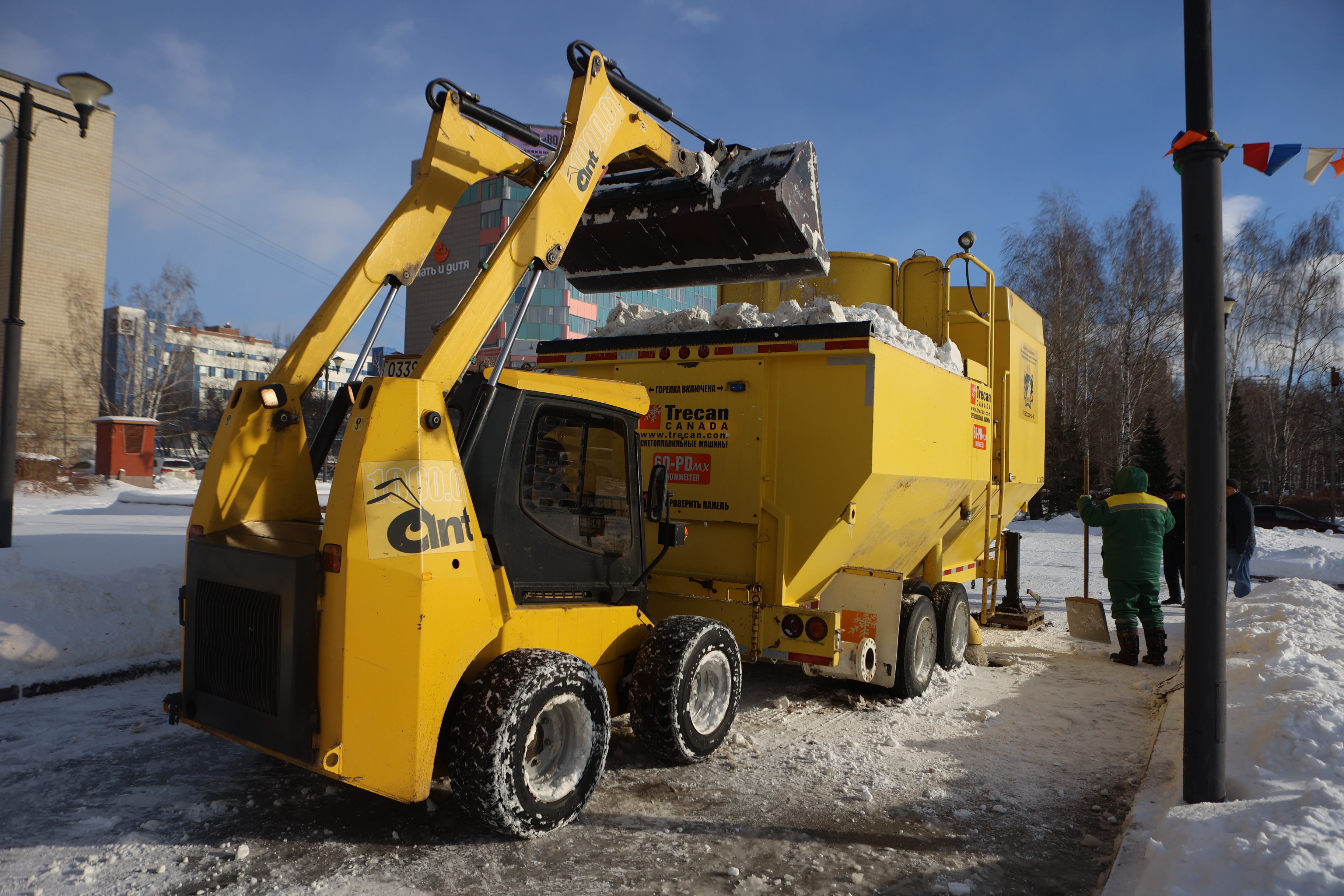 Снег с пешеходных дорожек загружают в бункер станции. Внутри осадки очищаются от мусора, плавятся, а воду можно сливать в ливневую канализацию. Главное преимущество установки в том, что снег не нужно везти за несколько километров на площадки для складирования.