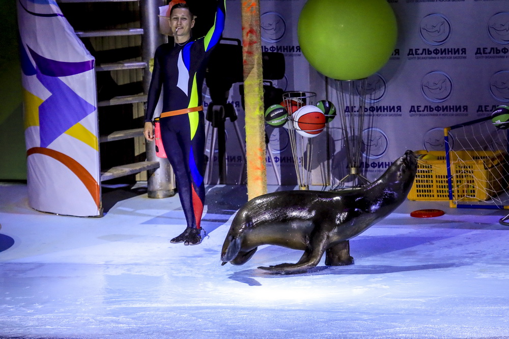 Морские львы не самые активные животные. Они любят лежать без дела, сушить шёрстку или плавать в своё удовольствие. Заинтересовать их можно вкусной рыбой. В «Дельфинийских играх» нет победителей. Все животные достойны призовых мест, а главное — аплодисментов и улыбок зрителей.