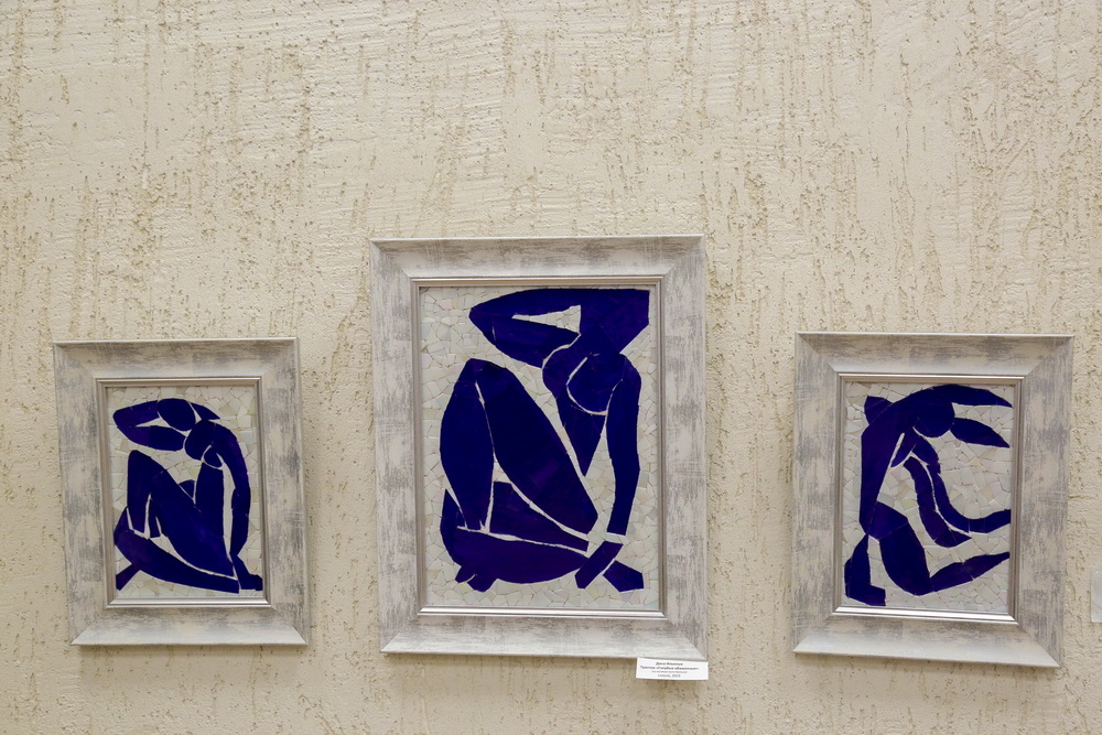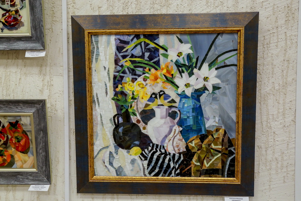 Кроме того, на выставке показывают мозаичные изделия по мотивам полотен других художников и авторские творения.
