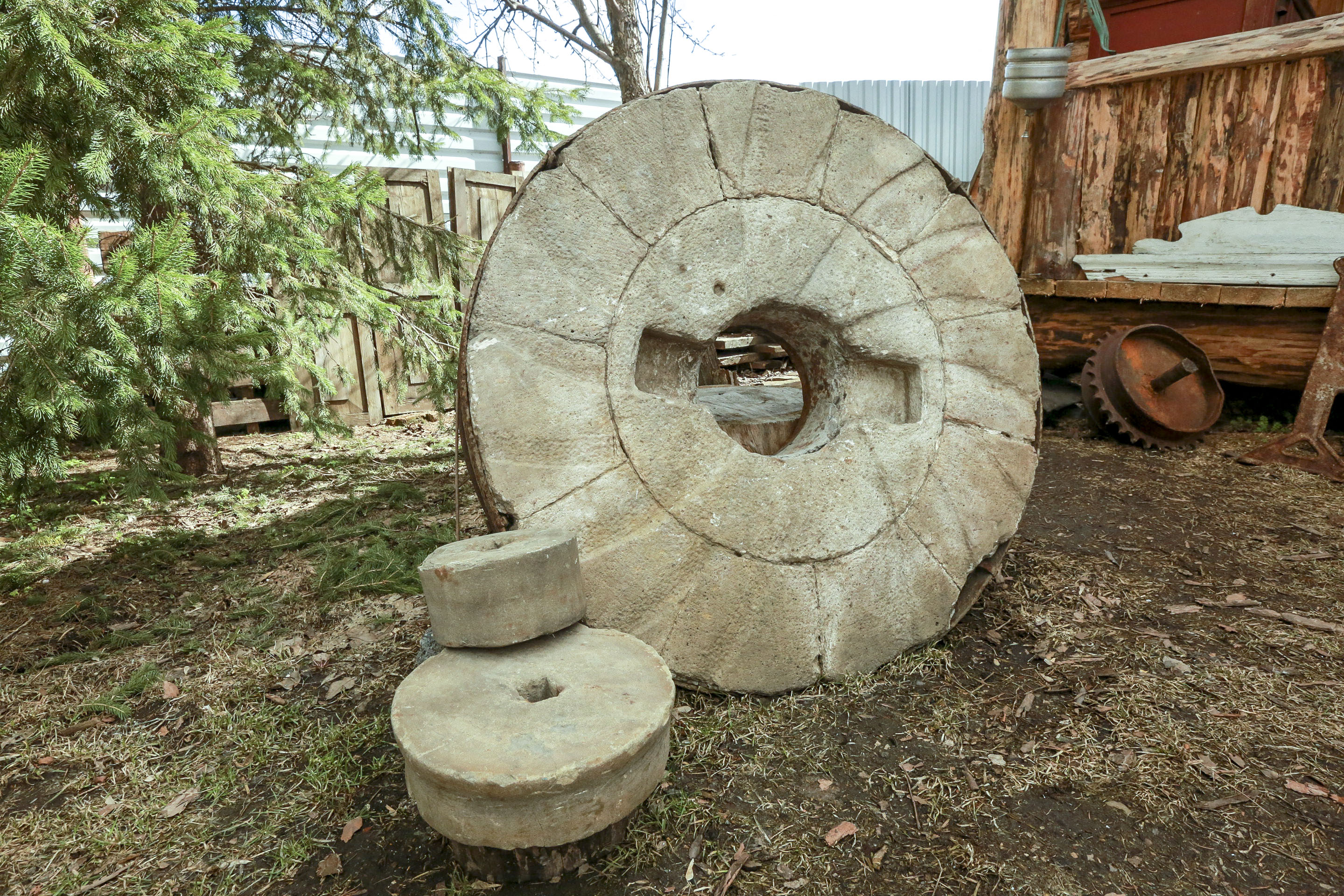 Жёрнов мельницы — один из самых колоритных уличных экспонатов. Он был найден на огороде. Штука тяжёлая — чтобы её переместить, пришлось заказывать спецтехнику. Мельниц в Буграх было много, но они все не сохранились. Антон Нелидов собирается ещё раз наведаться к месту, где был обнаружен жёрнов. Уверен, что там будут ещё интересные находки, достойные нового музея.