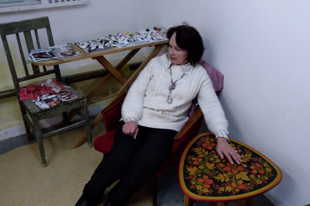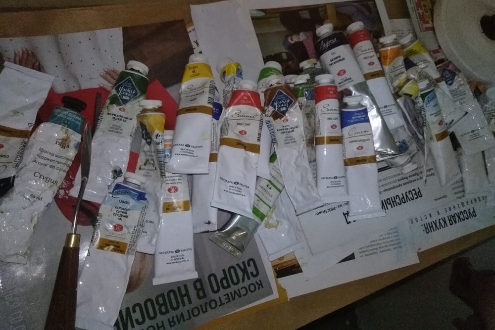 Тут же находится творческий уголок. Тут есть краски в тюбиках, незаконченные работы. Даже кресло здесь — 1960-х годов. Ребята тут работают в атмосфере того времени.
