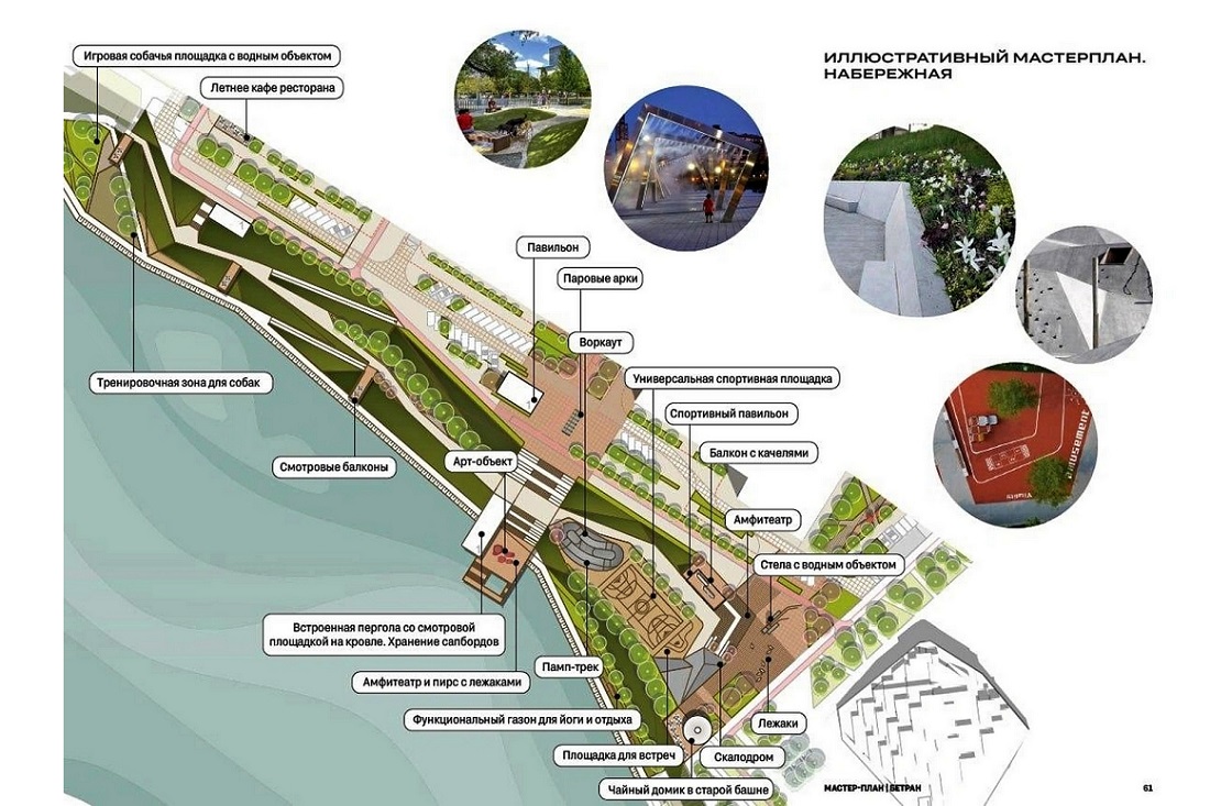 По информации застройщика, комфортная для пеших прогулок и отдыха территория протянется от комплекса «Скала» до ЖК «Марсель». Здесь появятся променад, кафе, смотровые площадки, газон для занятий йогой, памп-парк, скалодром, спортивный павильон и зона для хранения сапбордов. На всей площадке предусмотрено комплексное озеленение.