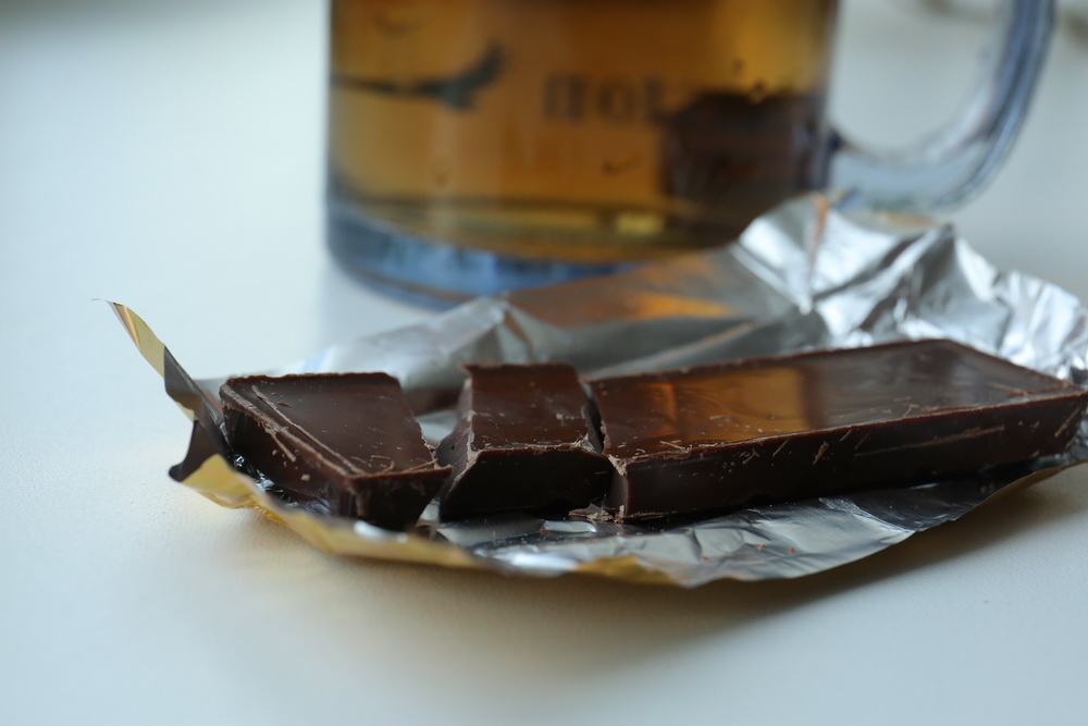 Растопить плитку шоколада на водяной бане. Соединить муку и какао-порошок, добавить половину молока, перемешать. Вторую половину молока подогреть и влить в шоколад. Растопить сливочное масло и добавить его к шоколадному молоку. Взбить яйца с солью и сахаром, добавить в тесто. Влить шоколадную массу в тесто, дать настояться два часа. Добавить коньяк, перемешать. Выпекать, как обычные блинчики. Подавать со сметаной, сгущёнкой или джемом.