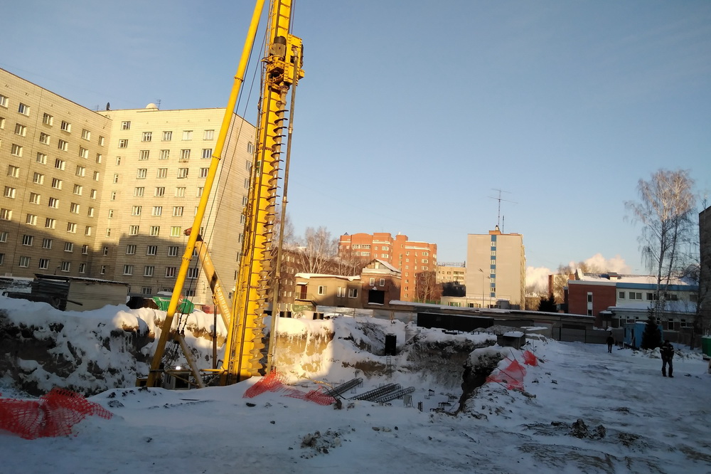 Строительный забор во дворе между бассейном НЭТИ и общежитием №2 на проспекте Маркса установили в начале зимы. Участок площадью 0,8 га разделён на две части старой трансформаторной будкой. В той части, где раньше был проезд, уже вырыли котлован и сейчас бурят скважины под свайный фундамент. На второй половине, где раньше был небольшой сквер, только начали рыть котлован.