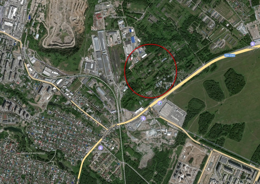 «Территория военной части. Находится на границе Новосибирска, прилегает к автодороге „Байкал“. Окружение объекта составляют жилой микрорайон, торгово-складские помещения и лесной массив.