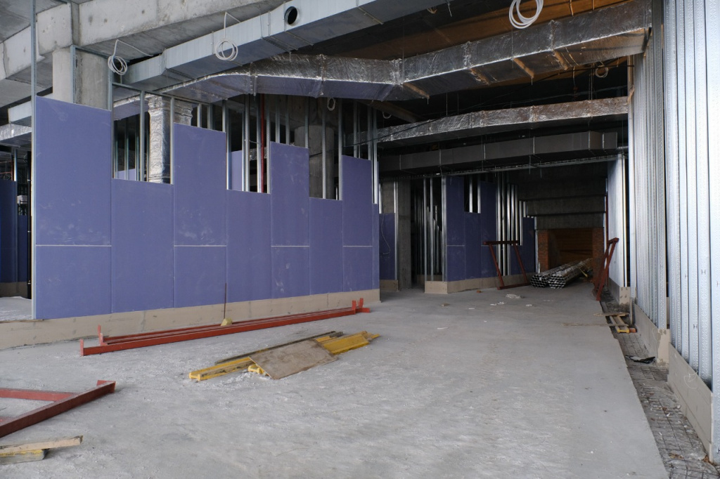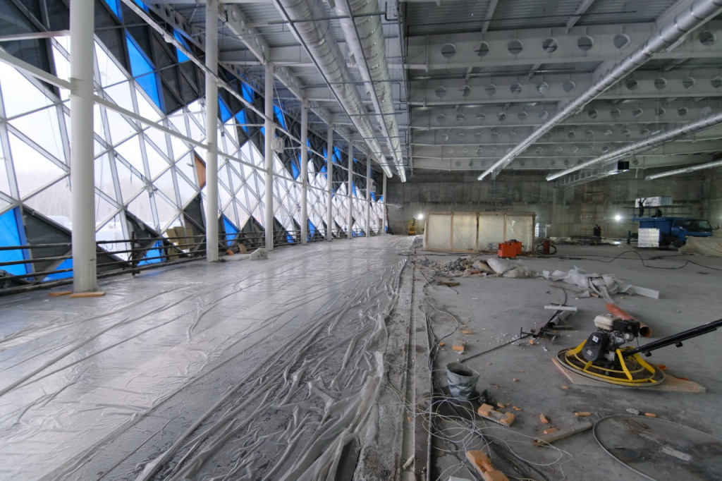 На малой тренировочной арене, которая уже прогрелась до положительных температур, начали укладку полов. Рабочие шлифуют бетонные конструкции и под установку сидений. Продолжают монтаж систем дымоудаления, вентиляции и слаботочных систем.