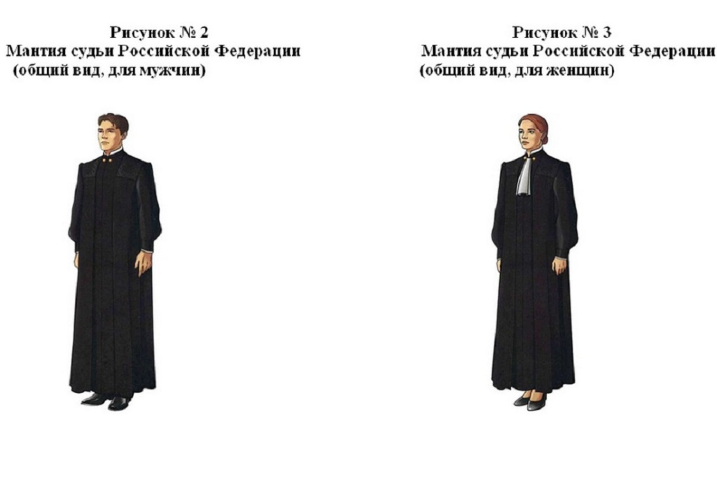 Одеяние должно быть выполнено из чёрной ткани, в состав которой входят шерсть, вискоза и полиэстер. В наборе для мужчин-судей идут три комплекта съёмных белых манжет и подворотников из креп-шифона, жёлтые металлические пуговицы с государственным гербом РФ. Женский вариант в дополнение к манжетам включает два съёмных жабо из лёгкой шелковистой ткани белого цвета.